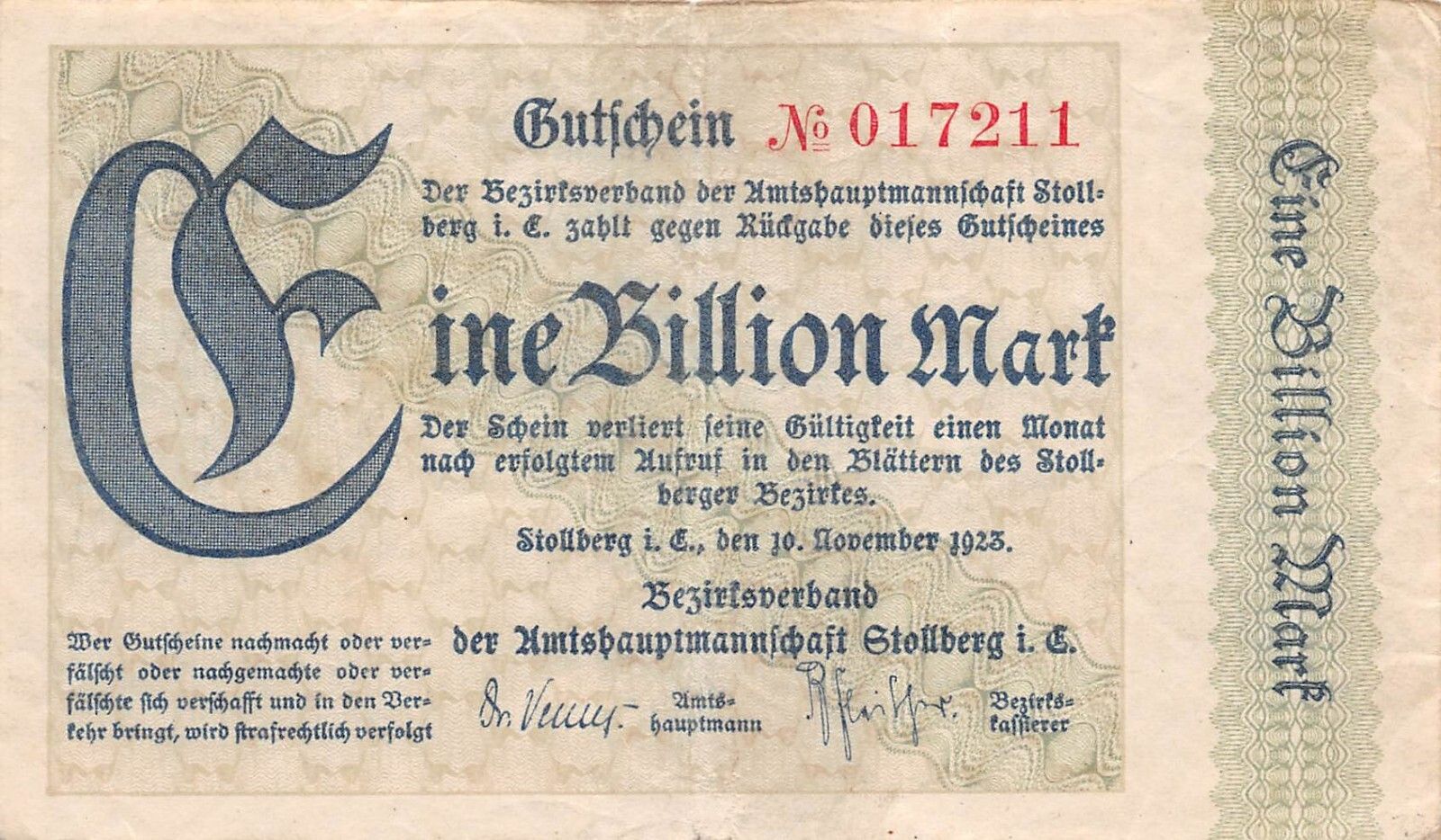 Original 1 Billion Mark Notgeld Banknote STOLLBERG 10.11.1923 Zustand: gebraucht