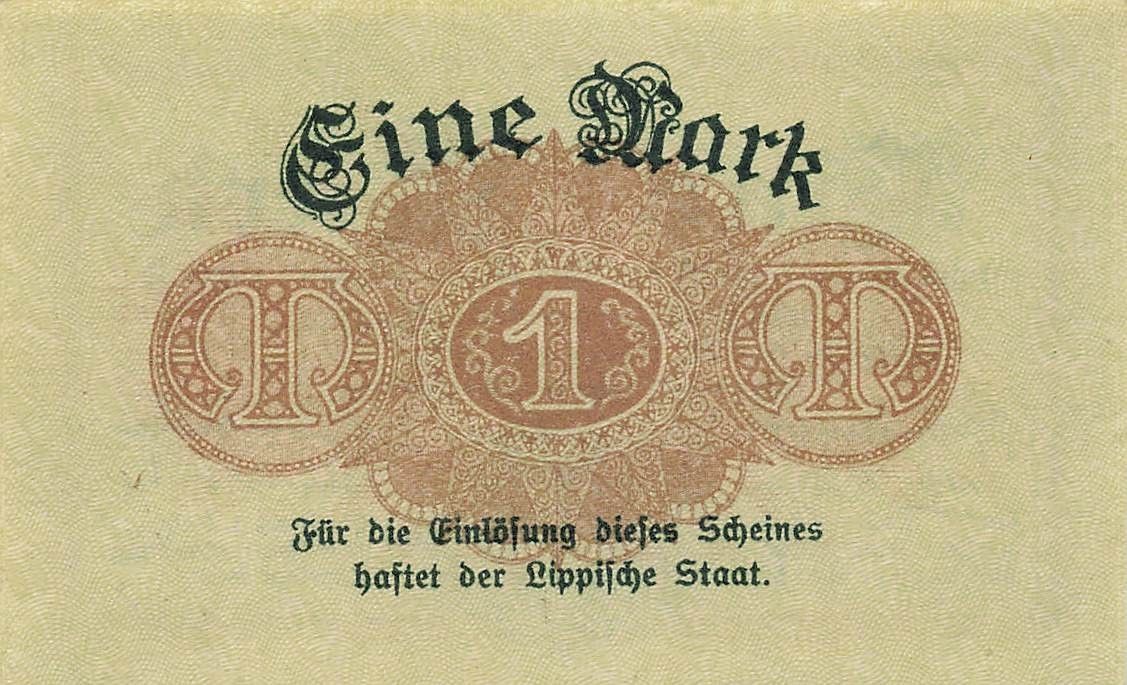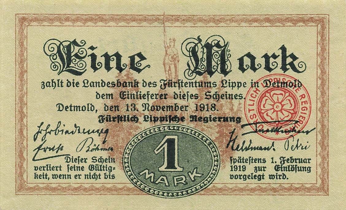 Original 1 Mark Notgeld DETMOLD Einlöse-Schein Landesbank des Fürstentums Lippe 1918