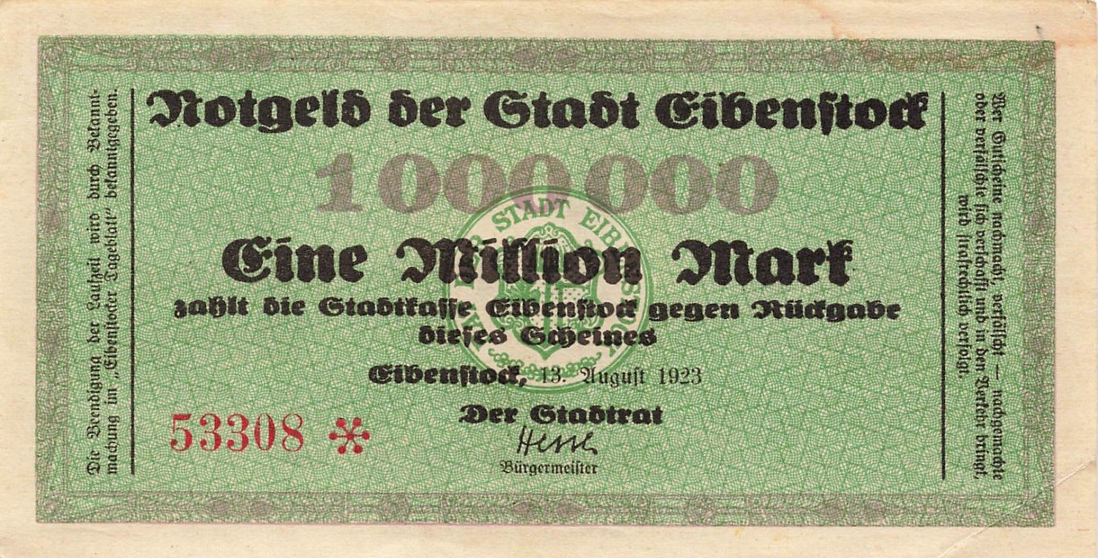 Original 1 Million Mark 13.08.1923 Notgeld der Stadt Eibenstock Zustand: gebraucht Echtheit wird garantiert.