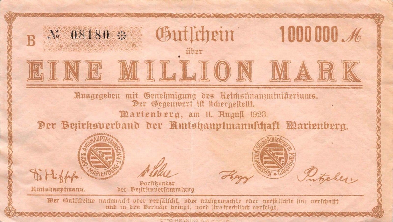 Original 1 Million Mark Notgeld Banknote Amtshauptmannschaft Marienberg 11.August 1923 Zustand: gebraucht Echtheit wird garantiert.