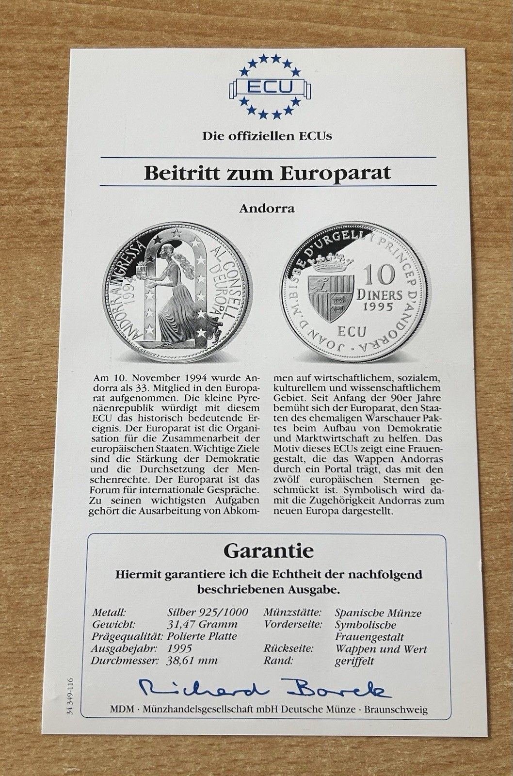 10 Diners 1995 Andorra Europarat PP Silber mit Zertifikat Material: Silber 925 Gewicht: 31,47 g Durchmesser: 38,61 mm Zustand siehe Originalbilder Echtheit wird garantiert.