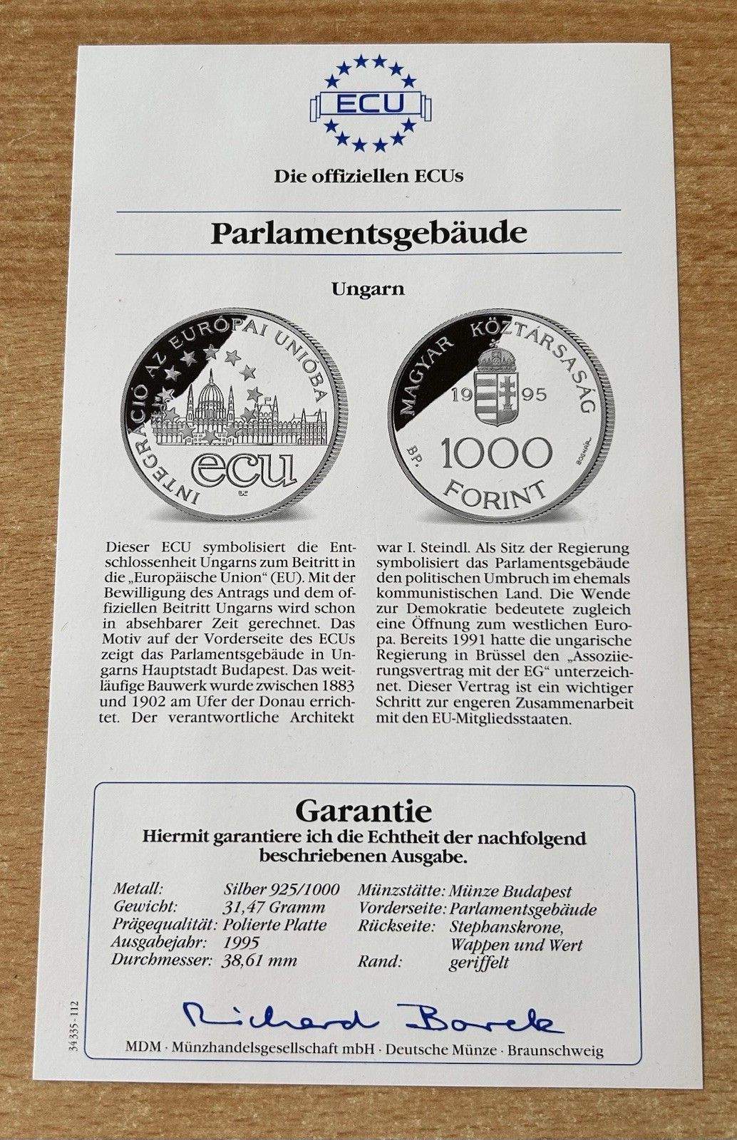 1000 Forint ECU 1995 Ungarn Parlament PP Silber mit Zertifikat Material: Silber 925 Gewicht: 31,47 g Durchmesser: 38,61 mm Zustand siehe Originalbilder Echtheit wird garantiert.