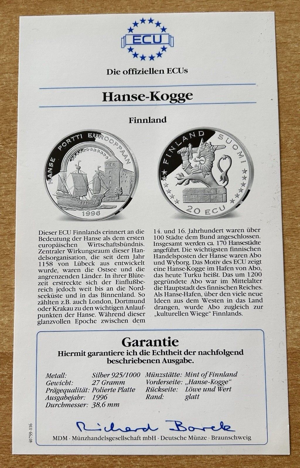 20 ECU 1996 Hanse Kogge Finnland PP Silber mit Zertifikat
