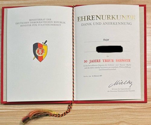 Zum Verkauf steht eine originale Urkunde für 30 Jahre treue Dienste im MfS der DDR. Diese Urkunde wurde an langjährige Mitarbeiter verliehen und ist ein historisches Dokument.