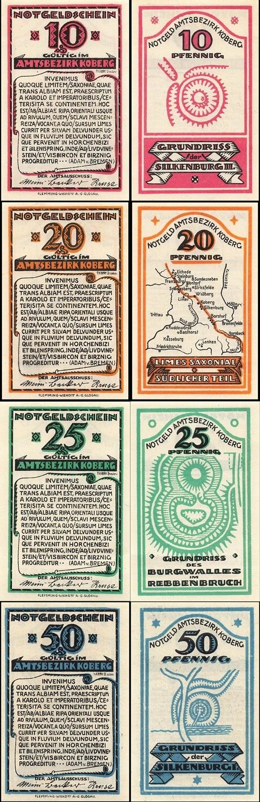 4 x Notgeld KOBERG Amtsbezirk Karte und Grundrisse