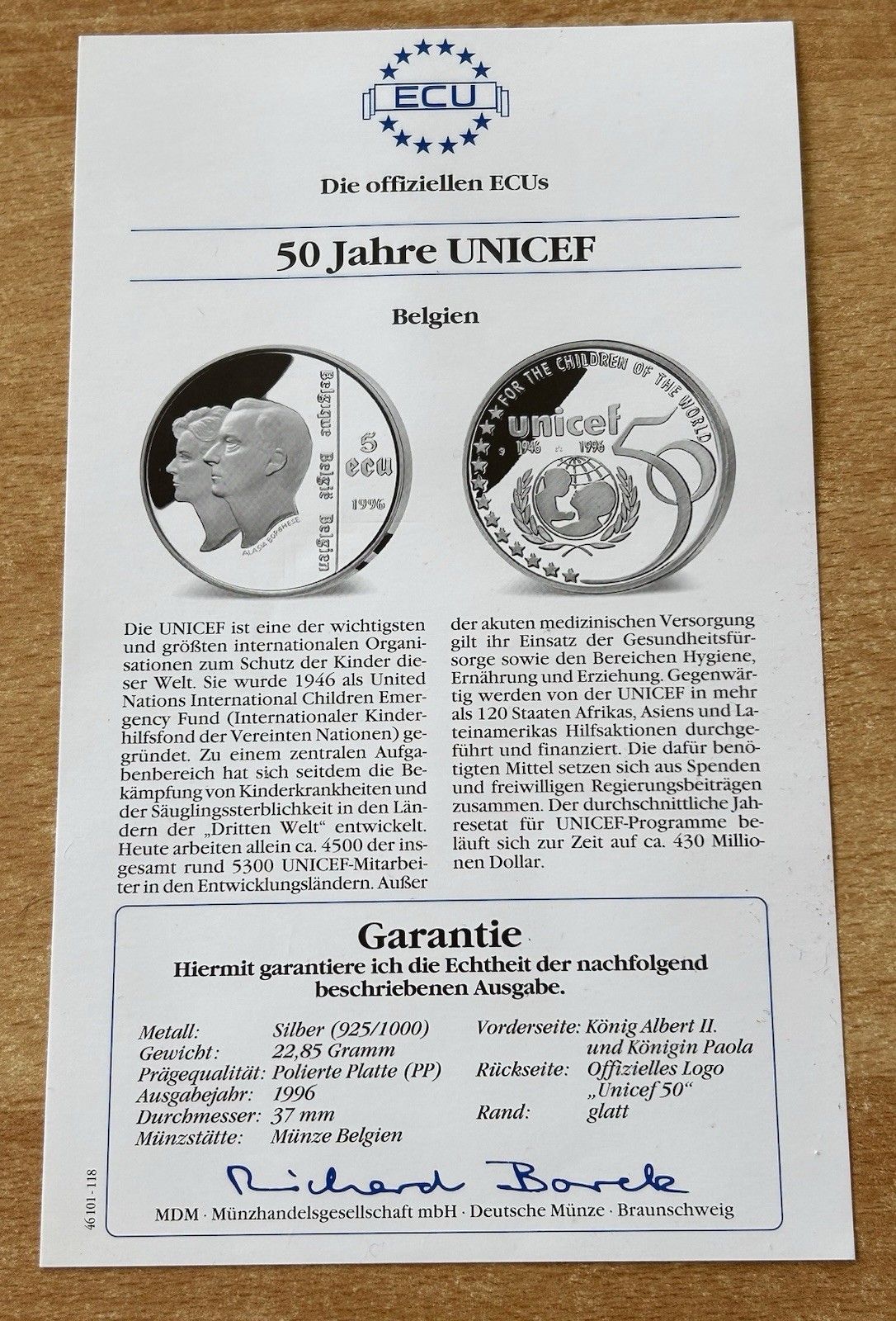 5 ECU 1996 Belgien 50 Jahre UNICEF PP Silber mit Zertifikat