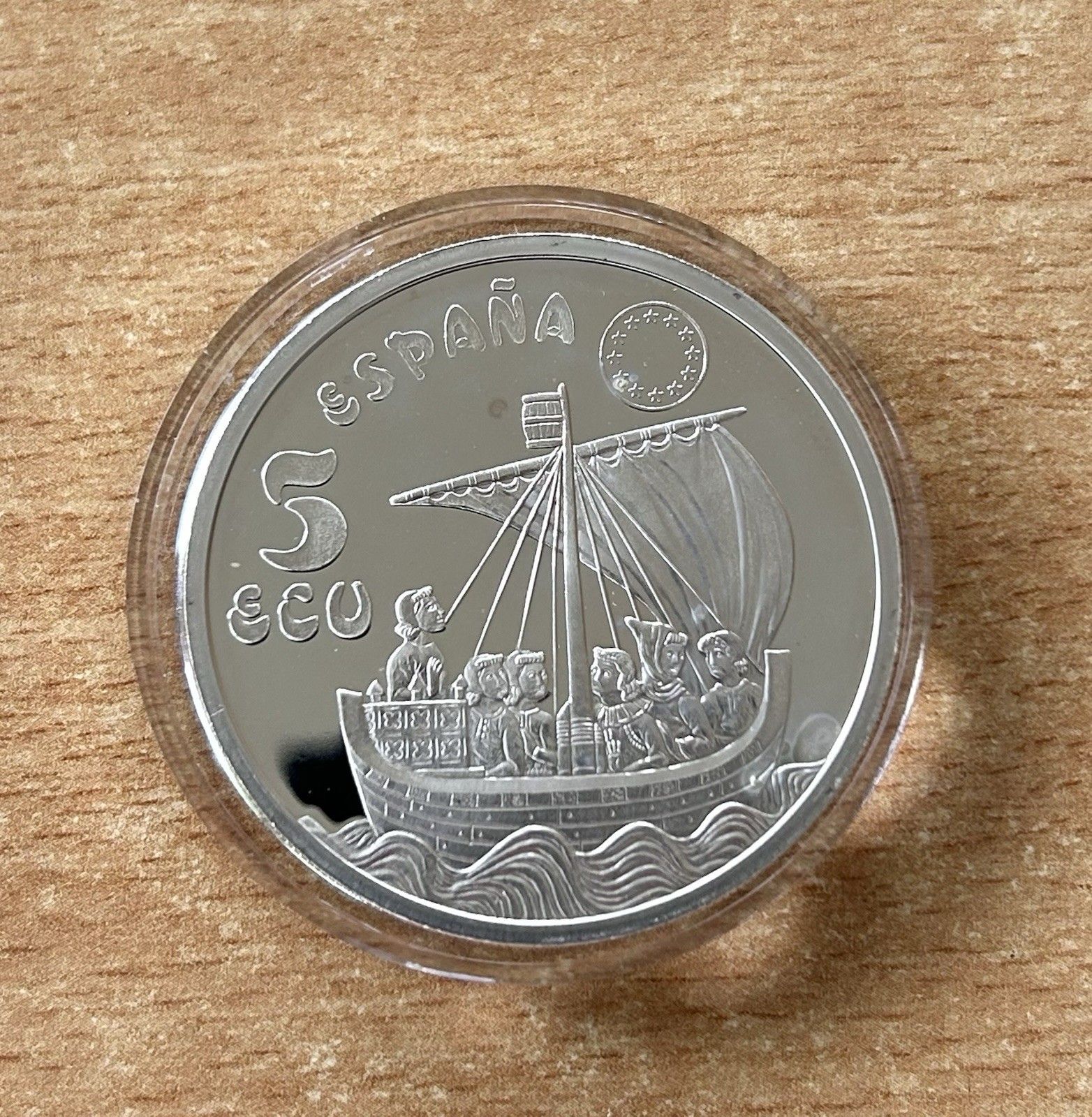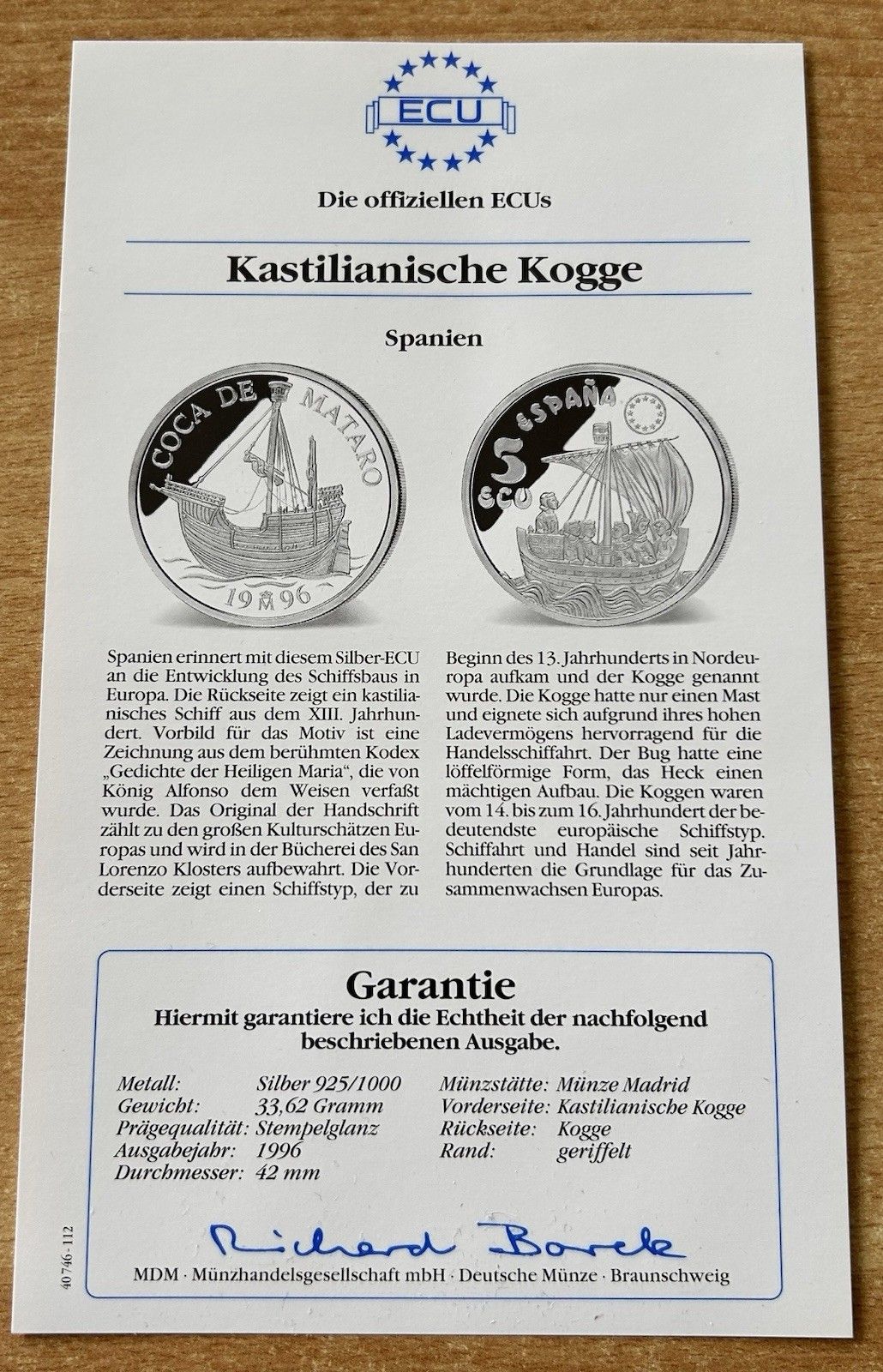 5 ECU 1996 Kastalianische Kogge Spanien PP Silber mit Zertifikat Material: Silber 925 Gewicht: 33,62 g Durchmesser: 42 mm Zustand siehe Originalbilder Echtheit wird garantiert.