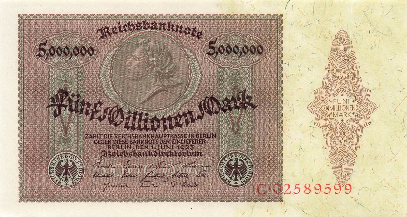 Original 5 Millionen Mark 01.06.1923 Reichsbanknote DEU-100 Kassenfrisch / UNC Echtheit wird garantiert.