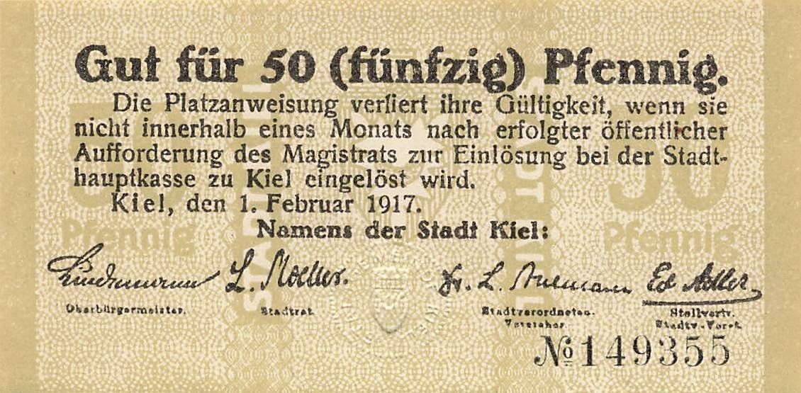 Original 50 Pfennig Notgeld KIEL Stadt 1.2.1917 Zustand: in guter Erhaltung Echtheit wird garantiert.