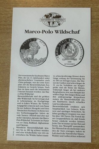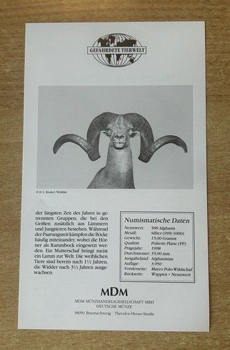 Gefährdete Tierwelt Afghanistan 500 Afghanis 1998 Marco Polo Wildschaf Silber PP mit Zertifikat Metal: Silber 999 Gewicht: 15g Durchmesser: 35mm Zustand siehe Originalbilder Echtheit wird garantiert.
