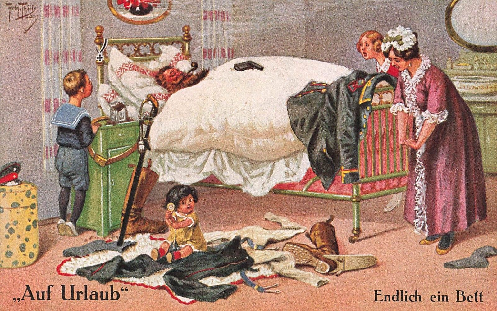 AK 1.WK Auf Urlaub Endlich ein Bett Soldat Familie Arthur Thiele Patriotika