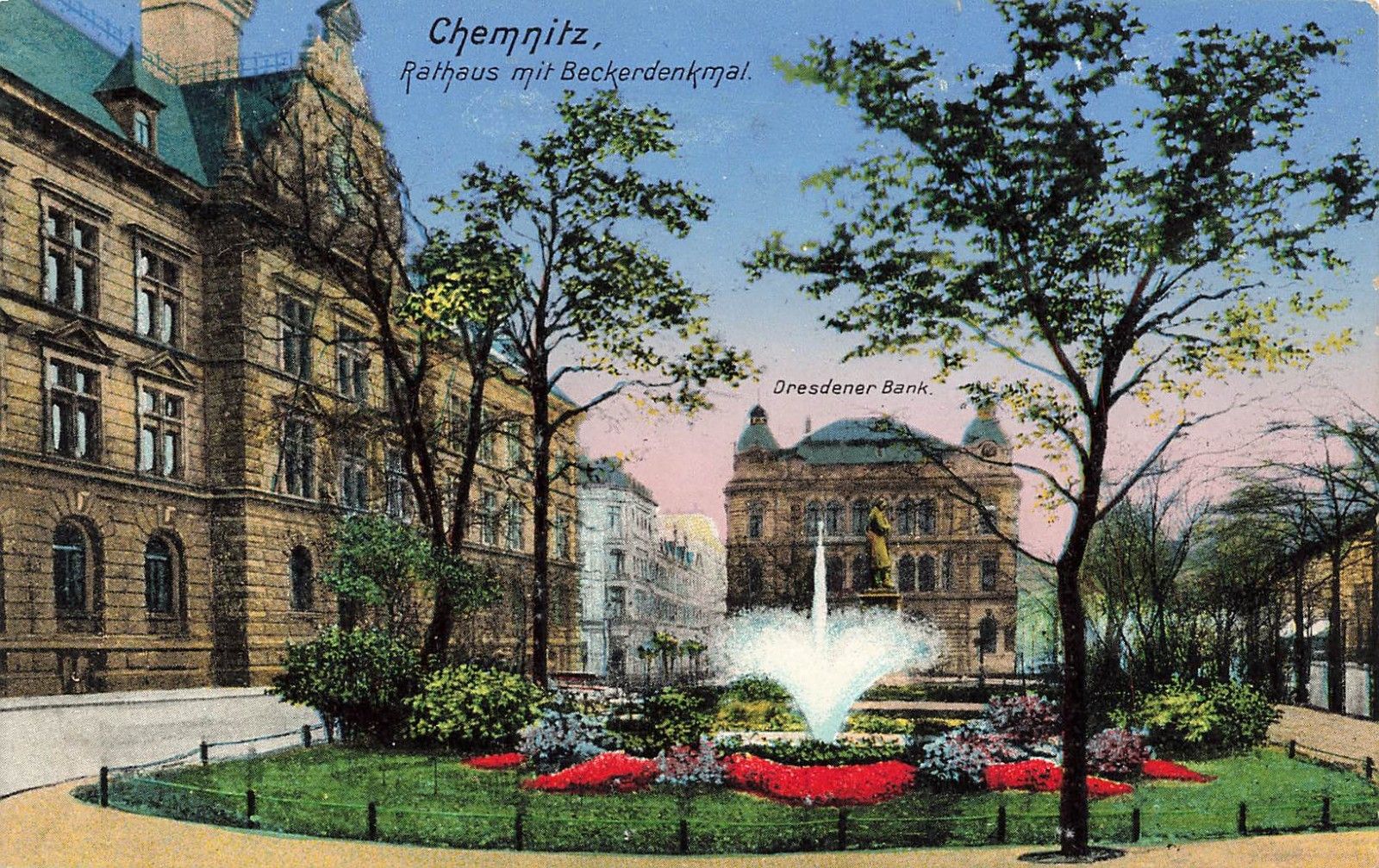 AK Chemnitz Rathaus Beckerdenkmal Dresdner Bank Sachsen 1915 gelaufen Postkarte