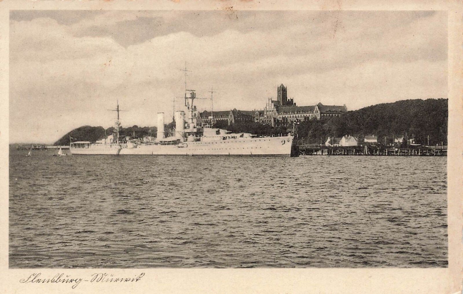 AK Flensburg-Mürwik Schiff Kreuzer Steg Schleswig-Holstein ungelaufen Postkarte