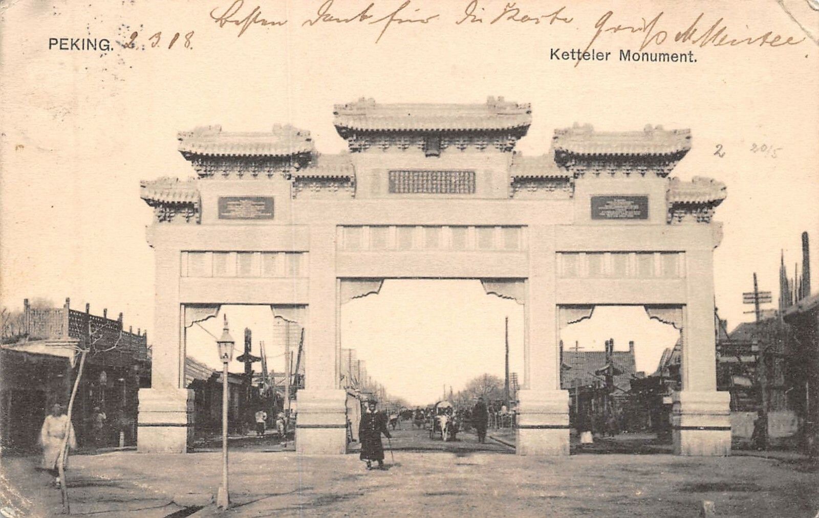 Original AK Peking Ketteler Monument gelaufen Deutsche Post in China Peking-Chemnitz 1908 Zustand: gute Erhaltung