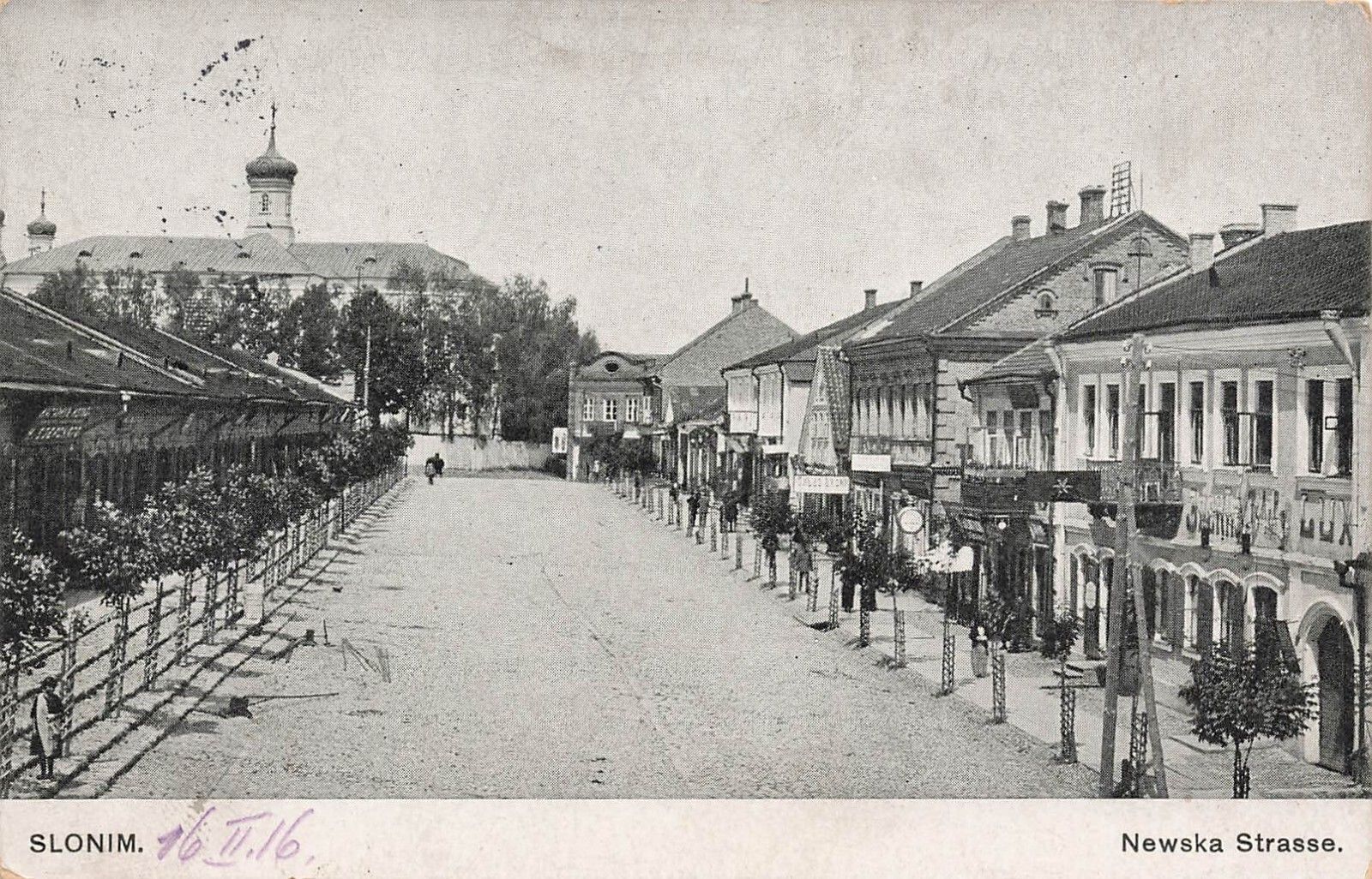 AK Slonim Newska Strasse Kirche Belarus 1916 gelaufen Postkarte