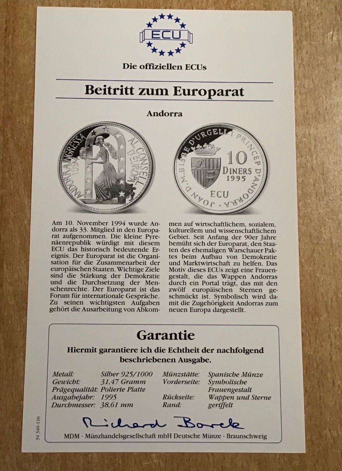 Andorra 10 Diners 1995 Beitritt zum Europarat PP Silber Ecu mit Zertifikat