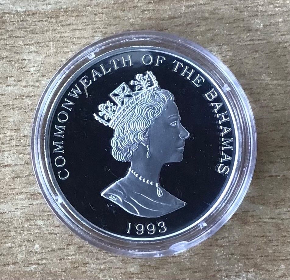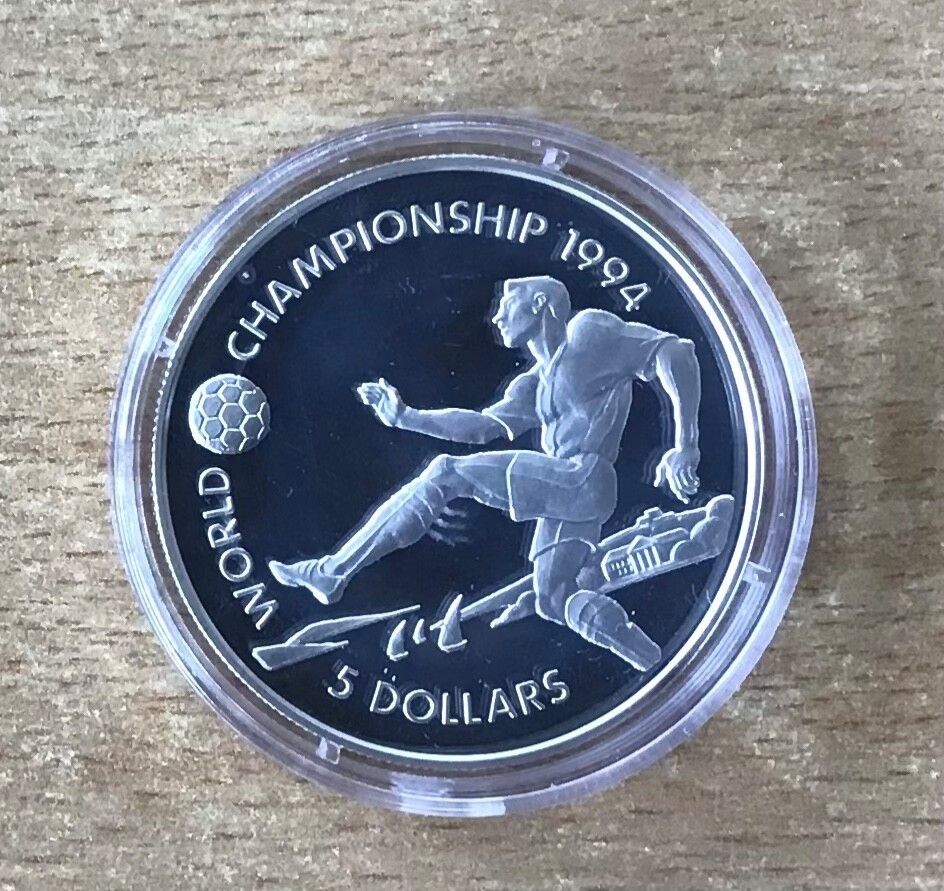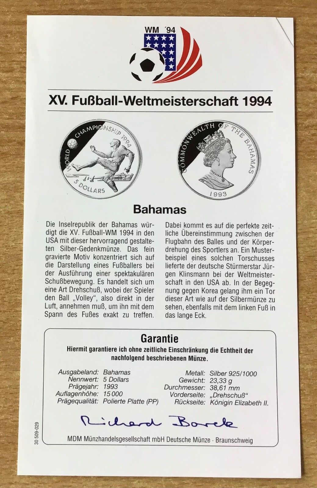 Bahamas 5 Dollars 1993 Drehschuss Fußball PP Silbermünze Zertifikat