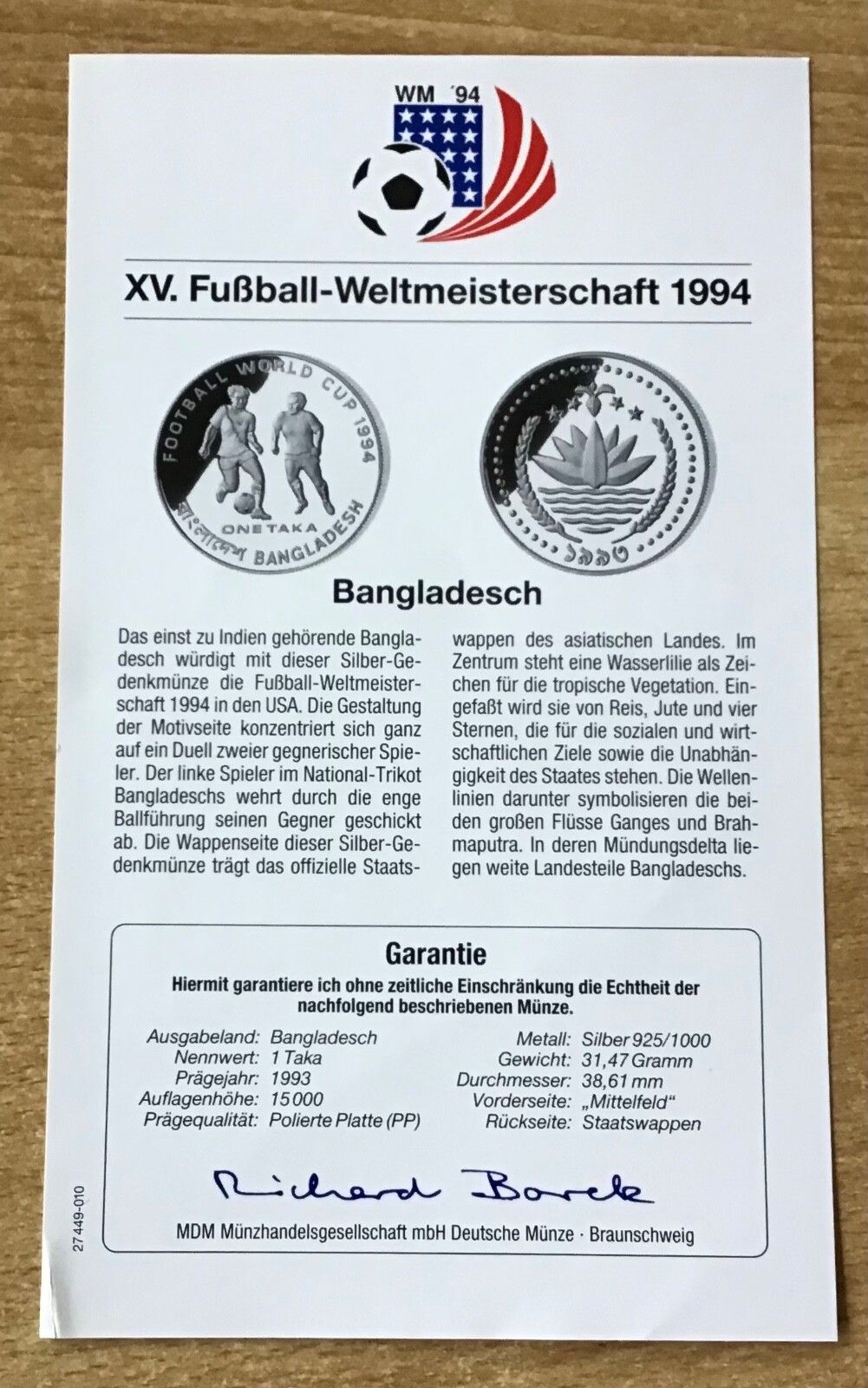 Bangladesch 1 Taka 1993 Mittelfeld Fußball PP Silbermünze Mit Zertifikat