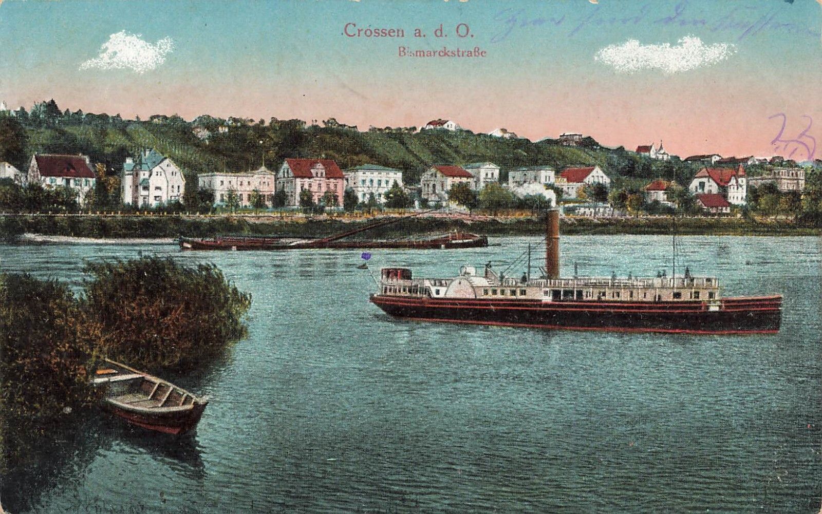 Bismarckstraße mit Dampfer Crossen an der Oder Ostbrandenburg Postkarte AK 1917