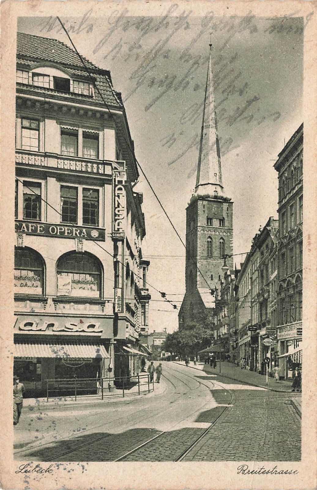 Breitestrasse mit Cafè Opera in Lübeck Schlwesig-Holstein Postkarte AK 1940