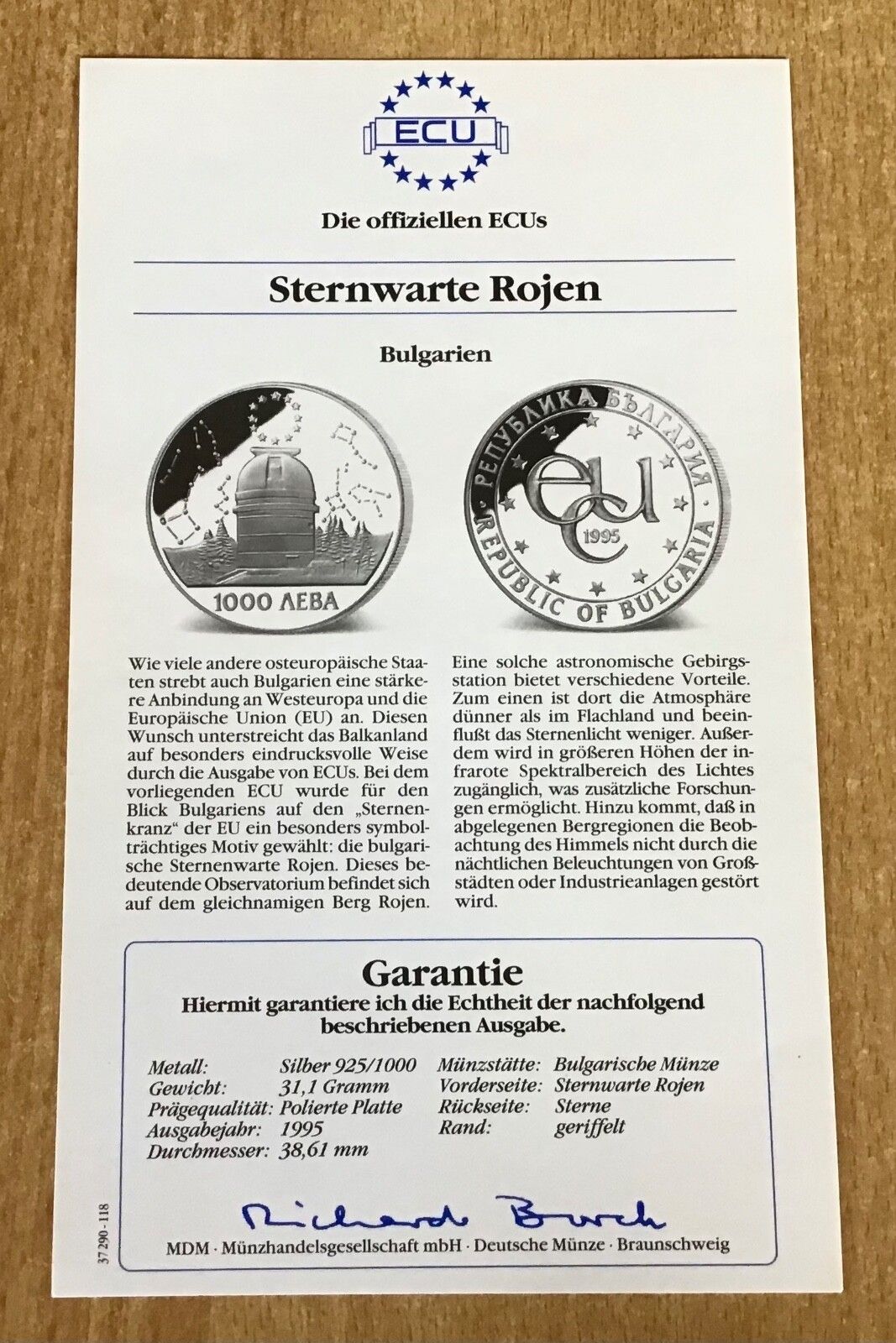 Bulgarien 1000 Leva 1995 Sternwarte Rojen Silber ECU PP Mit Zertifikat Material: 925 Silber Gewicht: 31 g Durchmesser: 38,61mm Zustand siehe Originalbilder Echtheit wird garantiert.