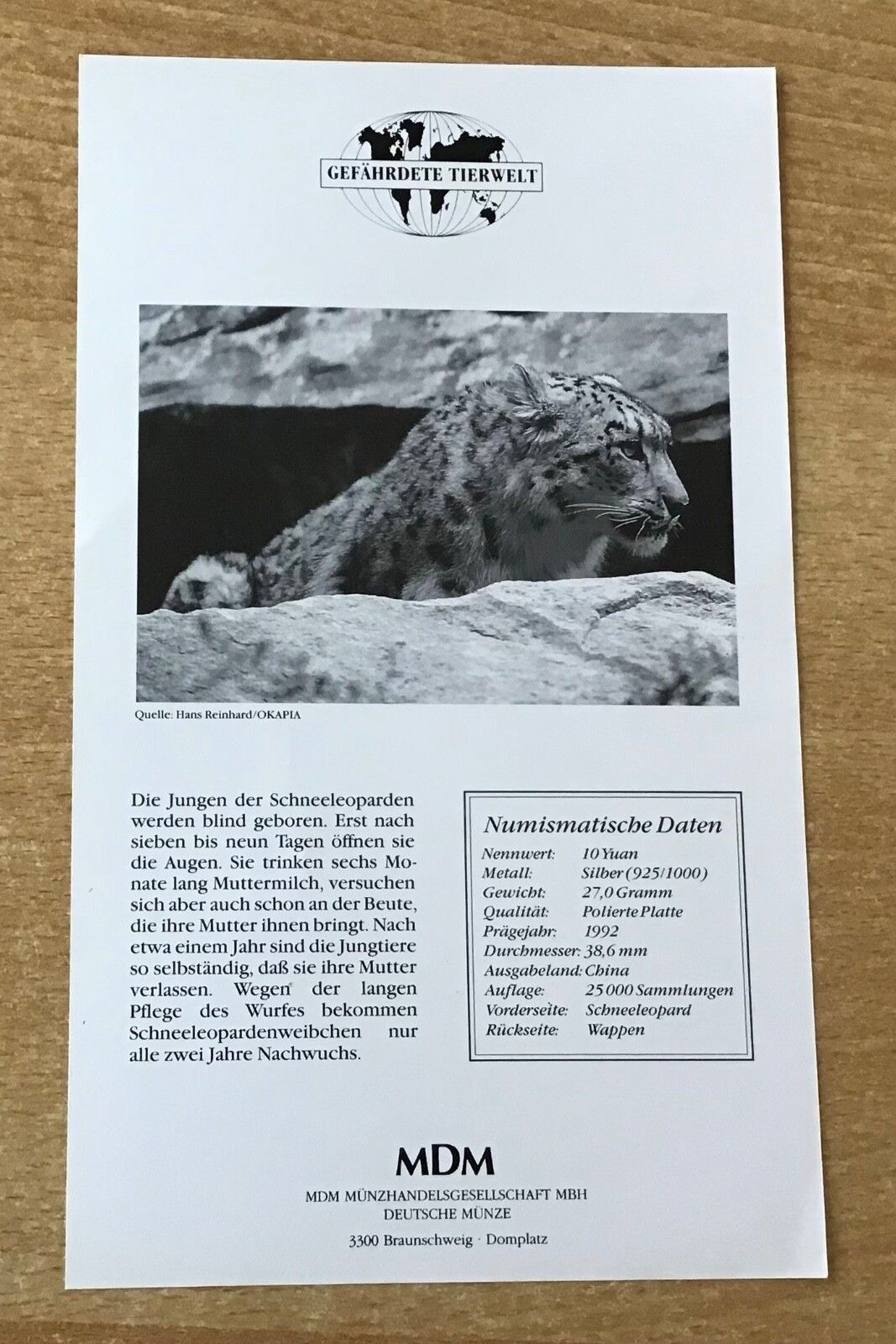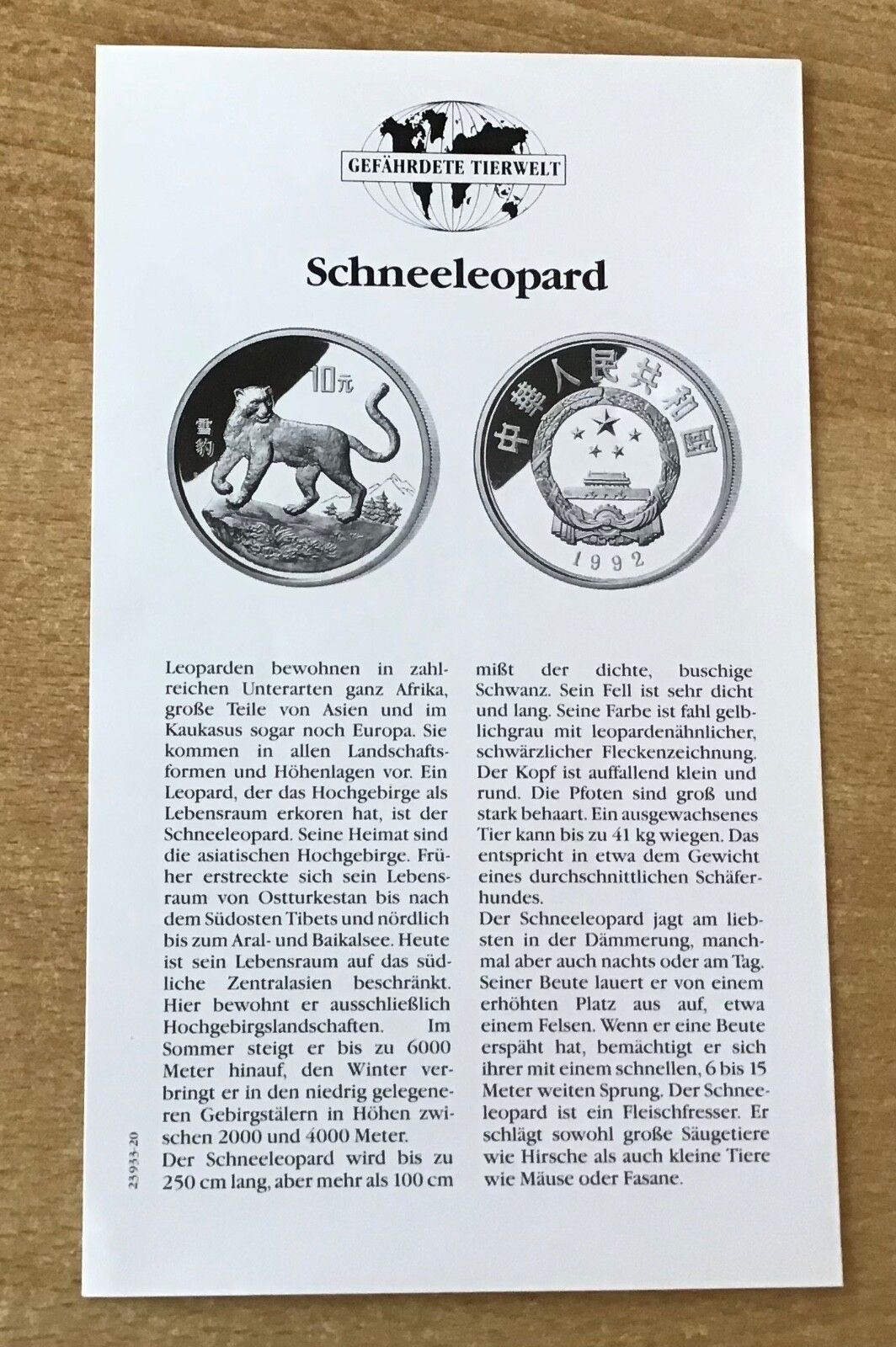 Gefährdete Tierwelt China 10 Yuan 1992 Silber PP mit Zertifikat Tierwelt Schneeleopard Metal: Silber 925 Durchmesser: 38,6 mm Gewicht: 27 g Zustand siehe Originalbilder Echtheit wird garantiert.