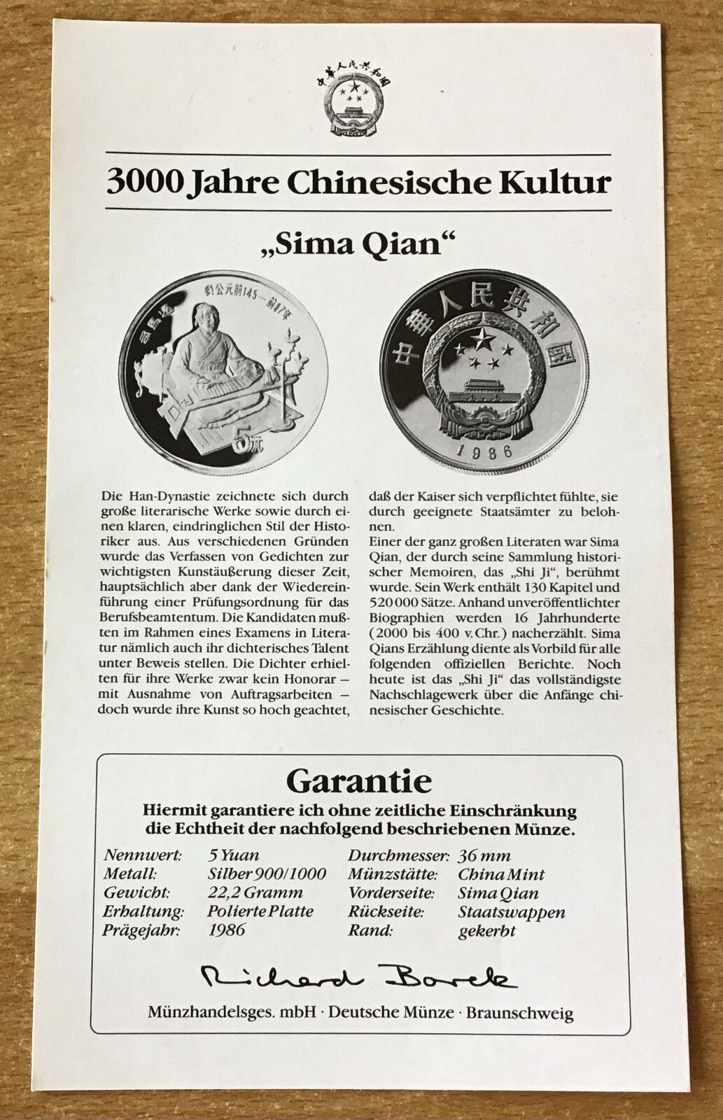 China 5 Yuan 1986 Sima Qian Silber PP mit Zertifikat Polierte Platte Material: Silber 0.900 Gewicht: 22,2g Durchmesser: 36 mm Zustand siehe Originalbilder Echtheit wird garantiert.