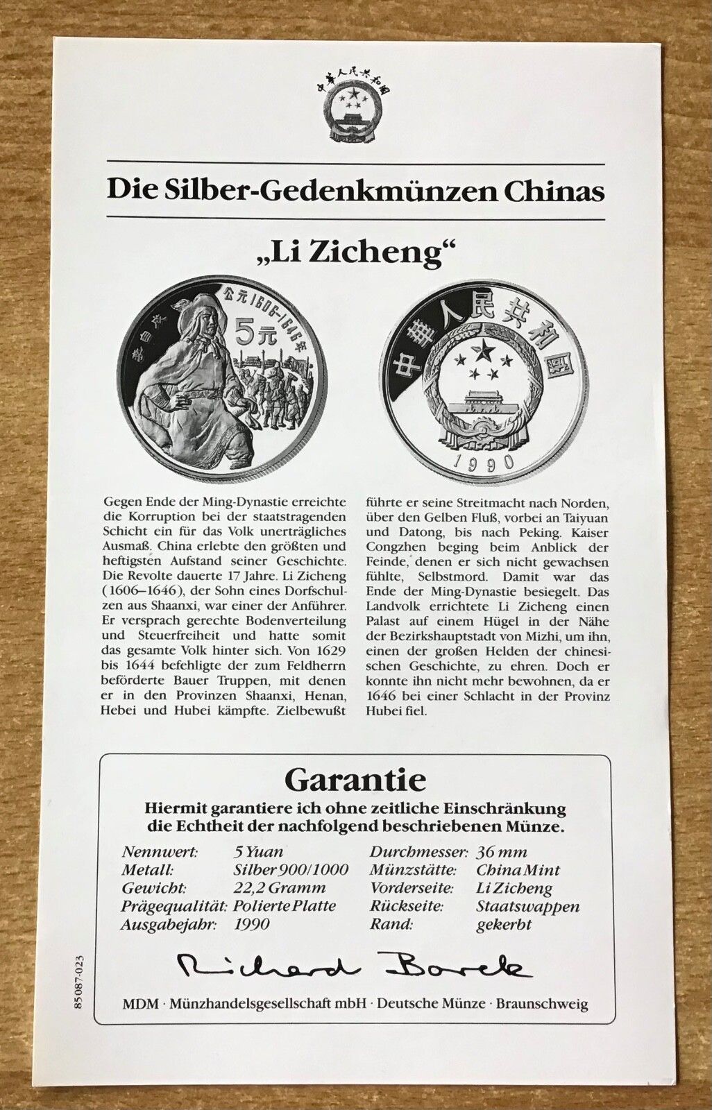China 5 Yuan 1990 Li Zicheng Silber PP mit Zertifikat Polierte Platte Material: Silber 0.900 Gewicht: 22,2 g Durchmesser: 36 mm Zustand siehe Originalbilder Echtheit wird garantiert.