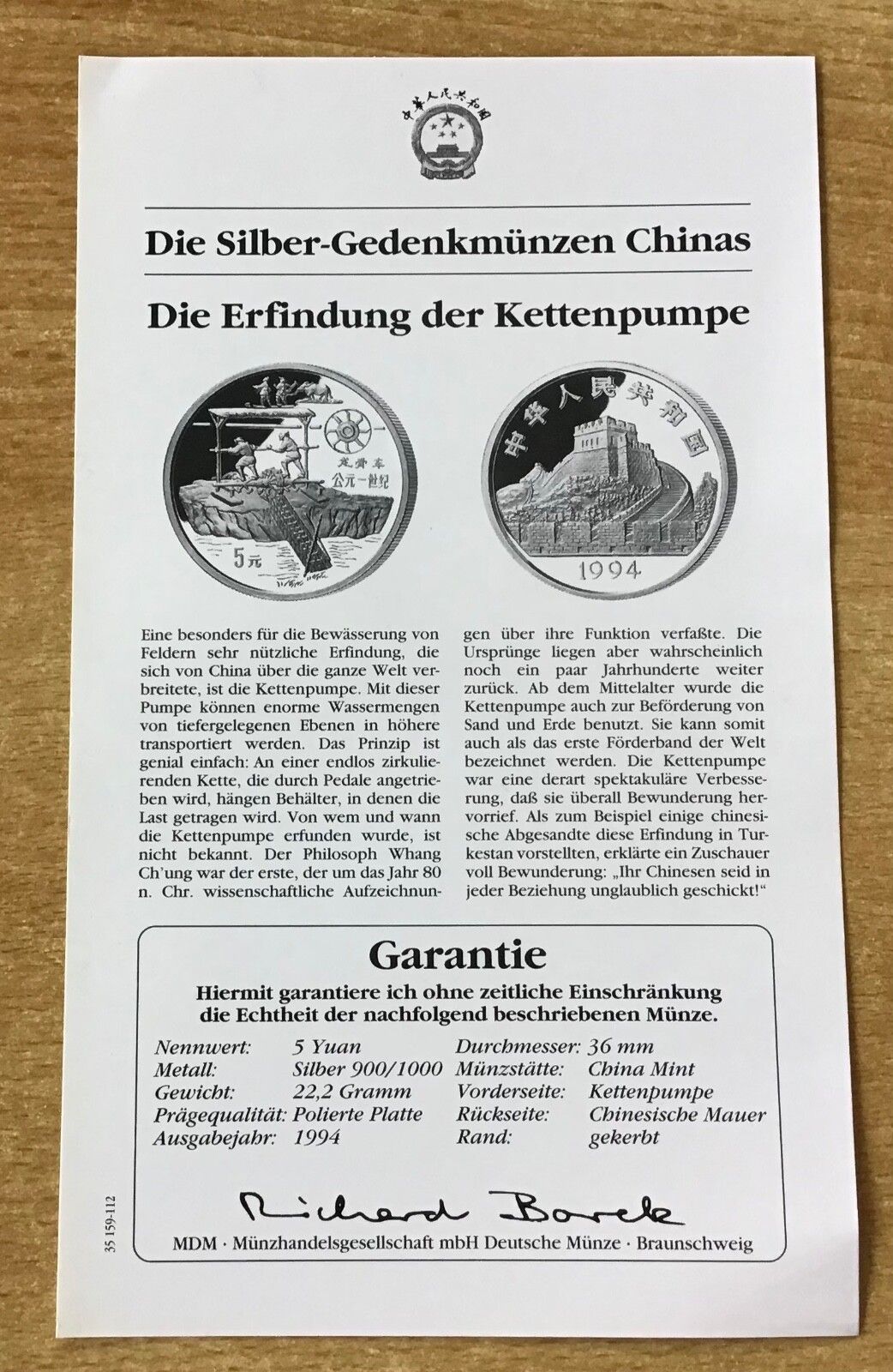 China 5 Yuan 1994 Kettenpumpe Silber PP mit Zertifikat