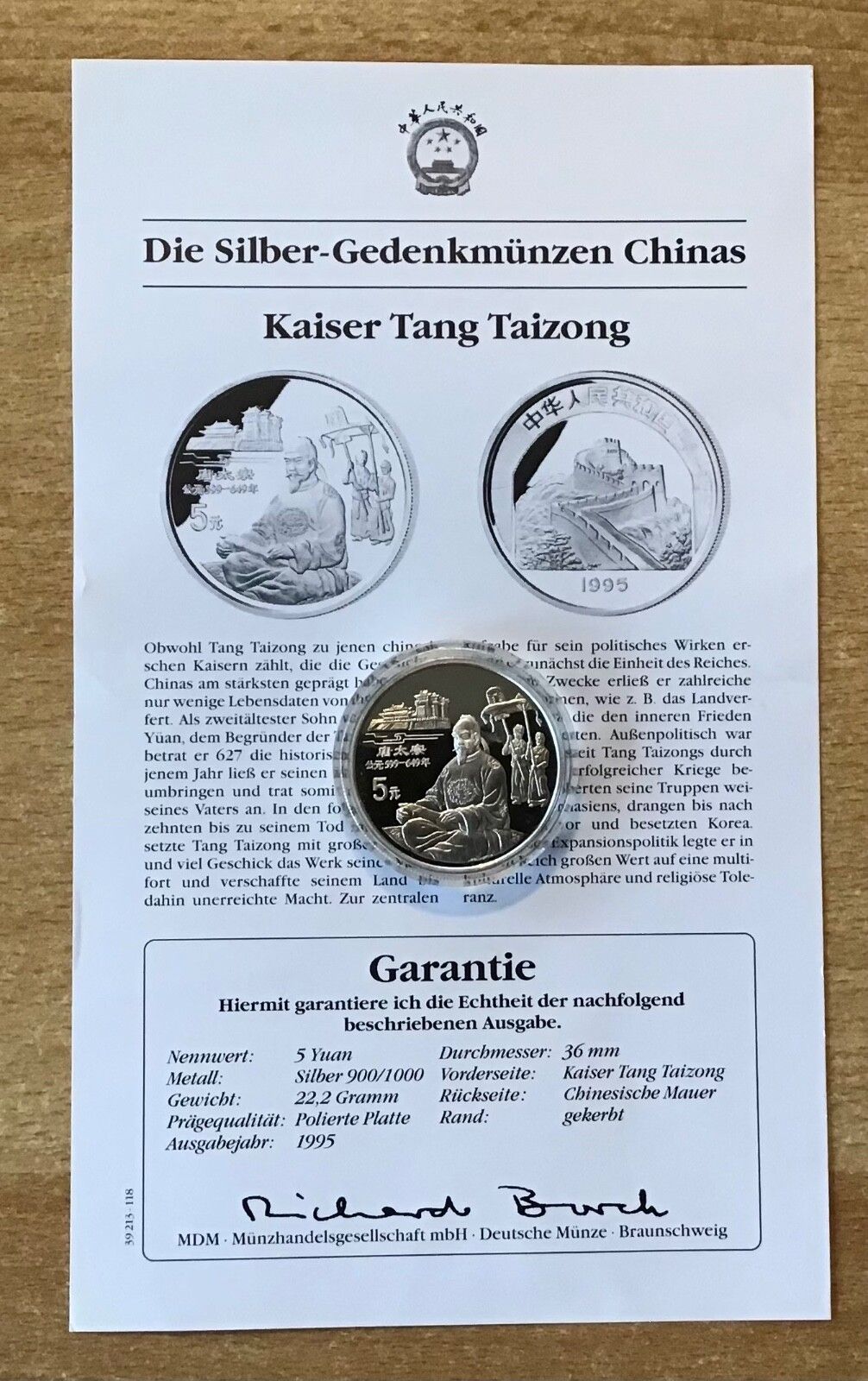 China 5 Yuan 1995 Kaiser Tang Taizong Silber PP mit Zertifikat