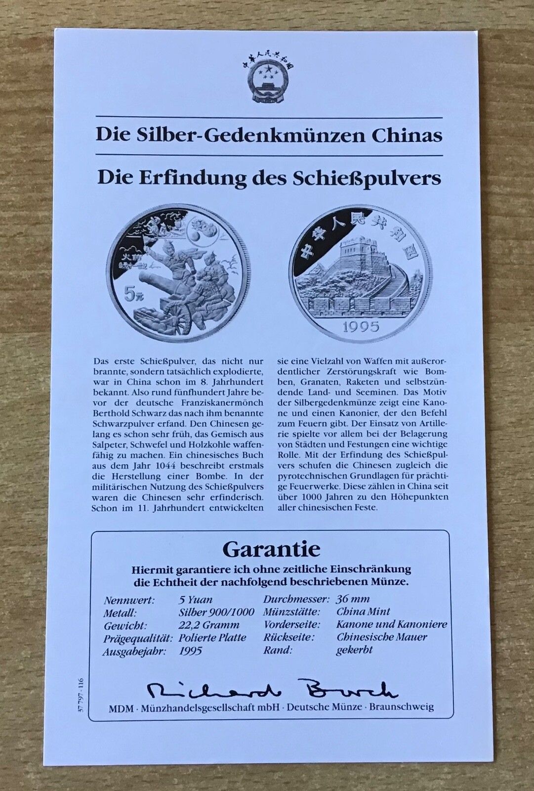China 5 Yuan 1995 KANONE Silber PP mit Zertifikat Polierte Platte Material: Silber 0.900 Gewicht: 22,2 g Durchmesser: 36 mm Zustand siehe Originalbilder Echtheit wird garantiert.