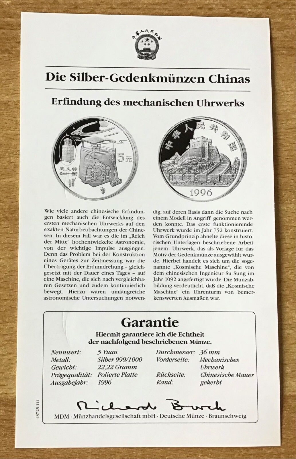 China 5 Yuan 1996 mechanische Uhrwerks Silber PP mit Zertifikat Polierte Platte Material: Silber 0.900 Gewicht: 22,2 g Durchmesser: 36 mm Zustand siehe Originalbilder Echtheit wird garantiert.