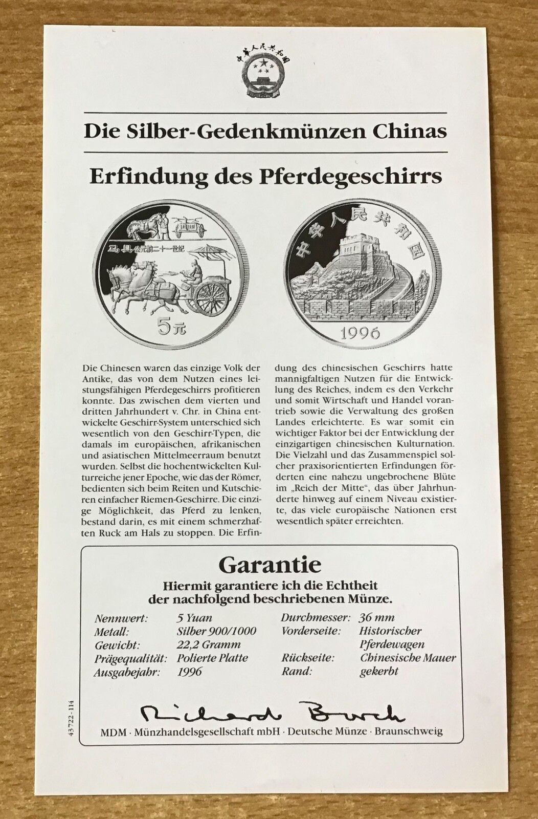 China 5 Yuan 1996 Pferdegeschirrs Silber PP mit Zertifikat Polierte Platte Material: Silber 0.900 Gewicht: 22,2g Durchmesser: 36 mm Zustand siehe Originalbilder Echtheit wird garantiert.