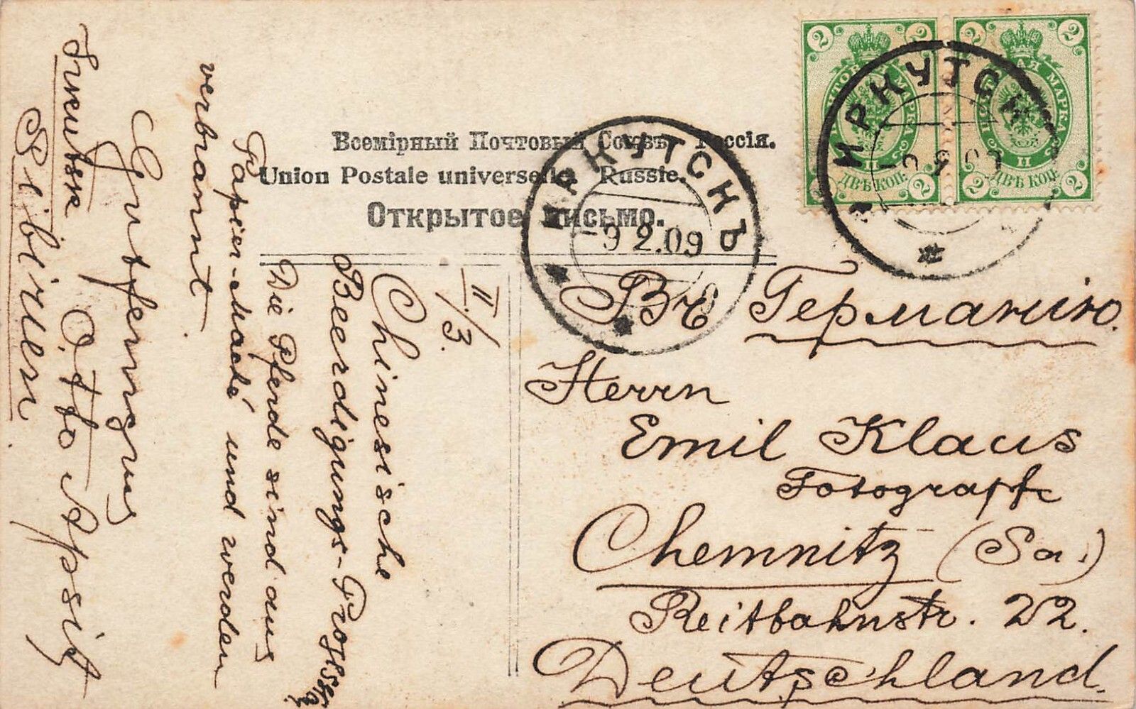 Rückseite: gelaufen 1909 von China über Irkutsk Siberien nach Deutschland Chemnitz