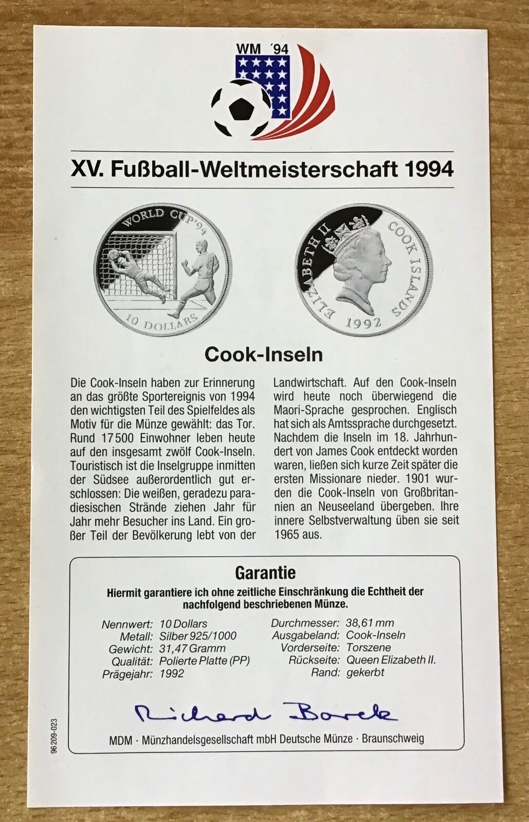 Cook -Inseln 10 Dollars 1992 Torszene Fußball PP Silbermünze Mit Zertifikat