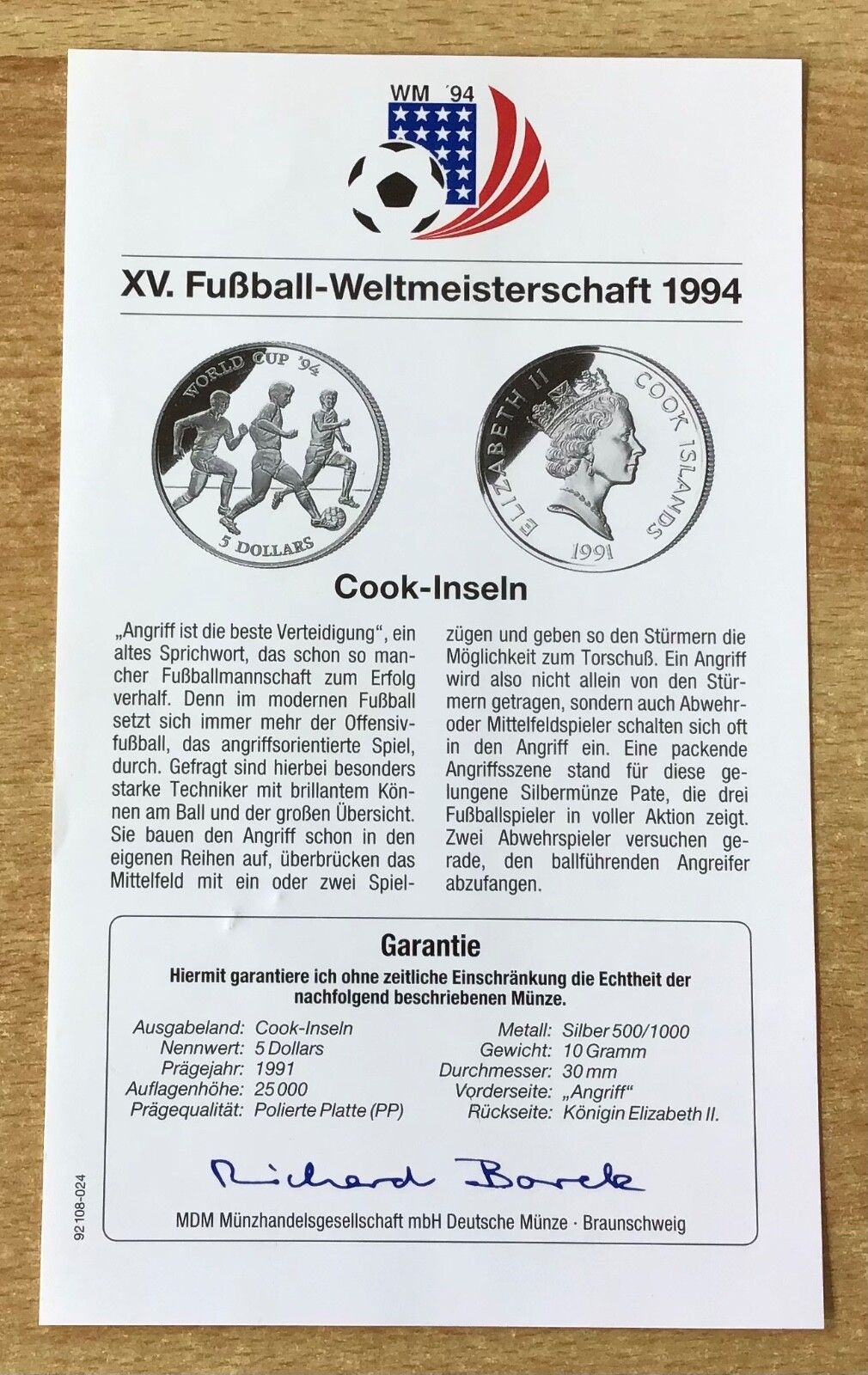 XV. Fußball - Weltmeisterschaft 1994 Cook - Inseln 5 Dollars 1991 Angriff Fußball PP Silbermünze Zertifikat Material: 500 Silber Gewicht: 10 g Durchmesser: 30 mm Zustand siehe Originalbilder Echtheit wird garantiert.
