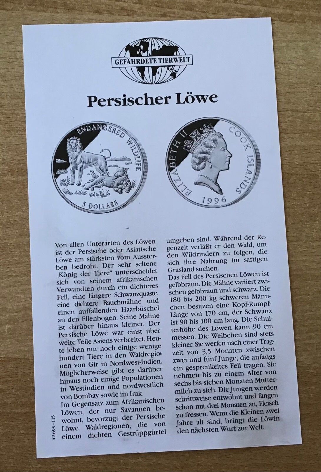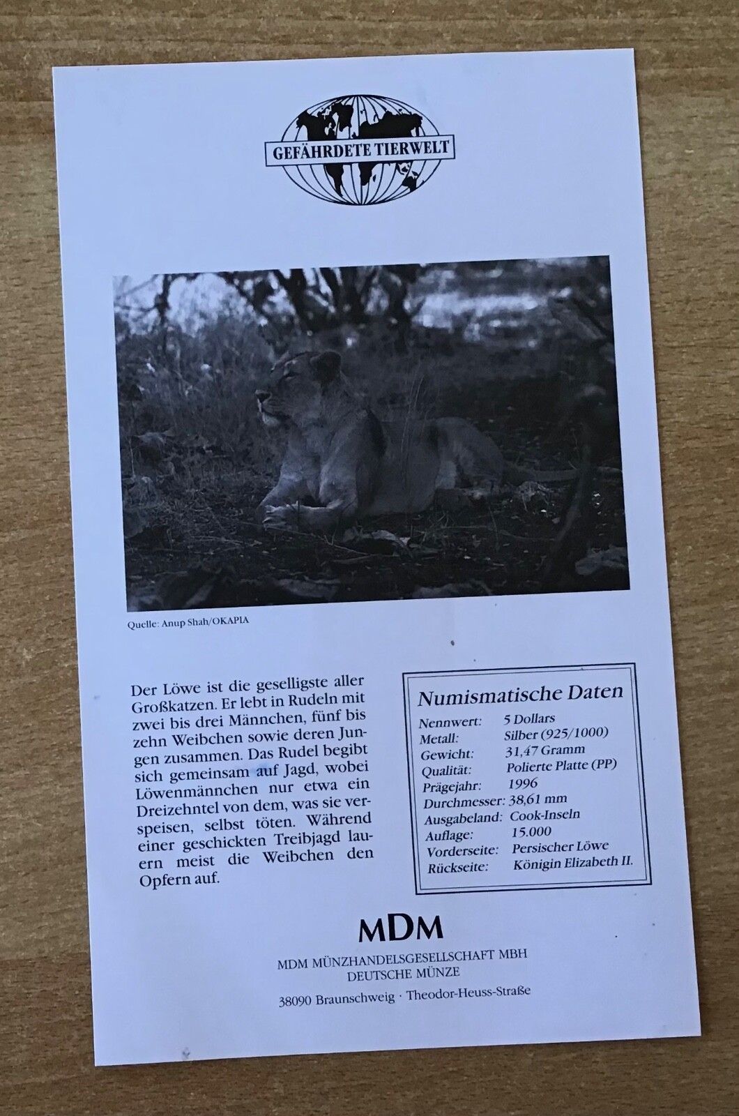 Gefährdete Tierwelt Cook Inseln 5 Dollars 1996 Löwe Silber PP mit Zertifikat Metal: Silber 925 Durchmesser: 38,61 mm Gewicht: 31,47 g Zustand siehe Originalbilder Echtheit wird garantiert.