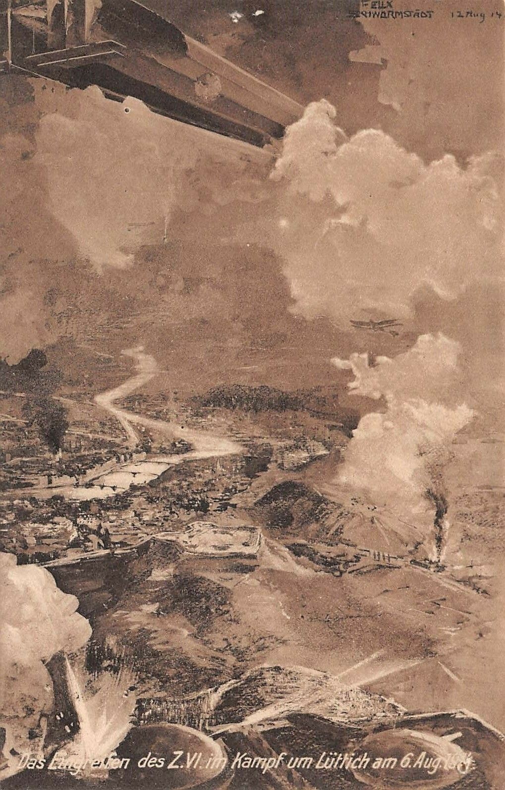 Das Eingreifen des Zeppelin VI im Kampf um Lüttich Patriotika Postkarte AK