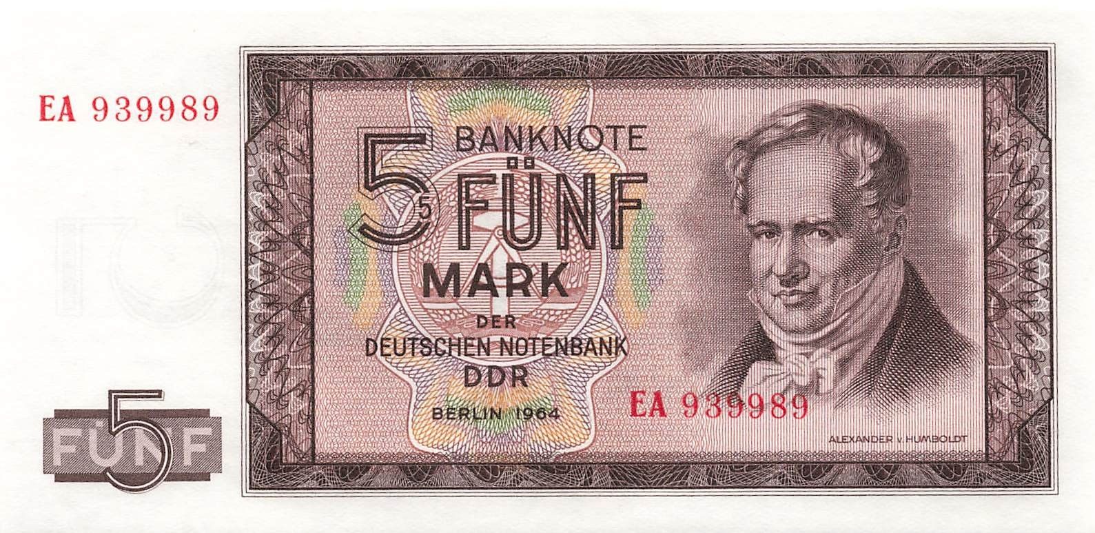 Original DDR Banknote 5 Mark 1964 Alexander v. Humboldt Ro: 354a Kassenfrisch / UNC Zustand: Kassenfrisch Echtheit wird garantiert.
