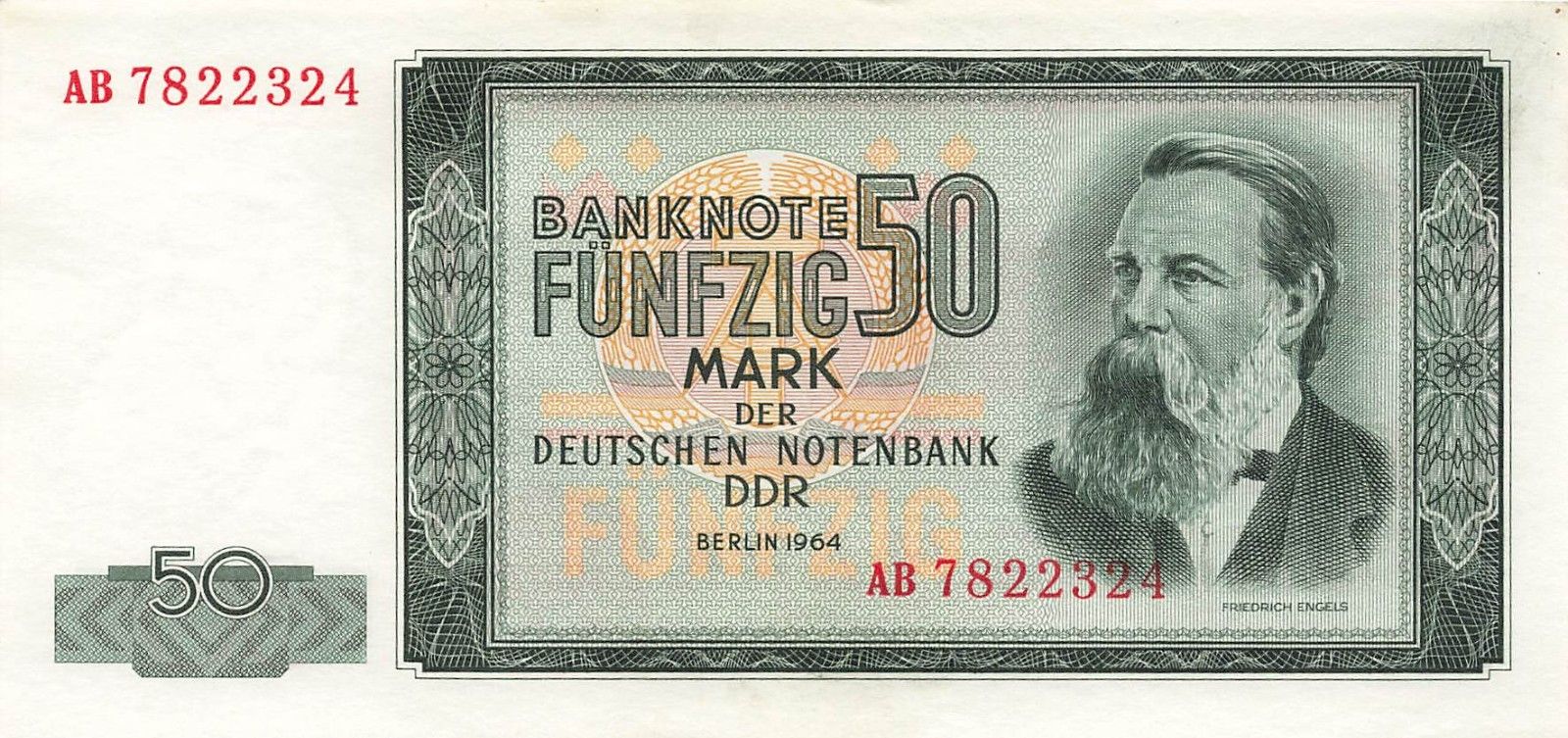 Original DDR Banknote 50 Mark 1964 Friedrich Engels Ro: 357 Zustand: fast Kassenfrisch/UNC Echtheit wird garantiert.