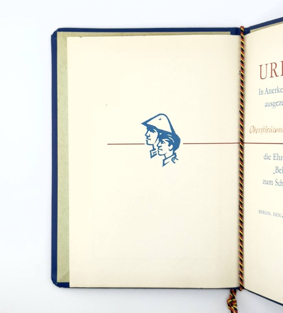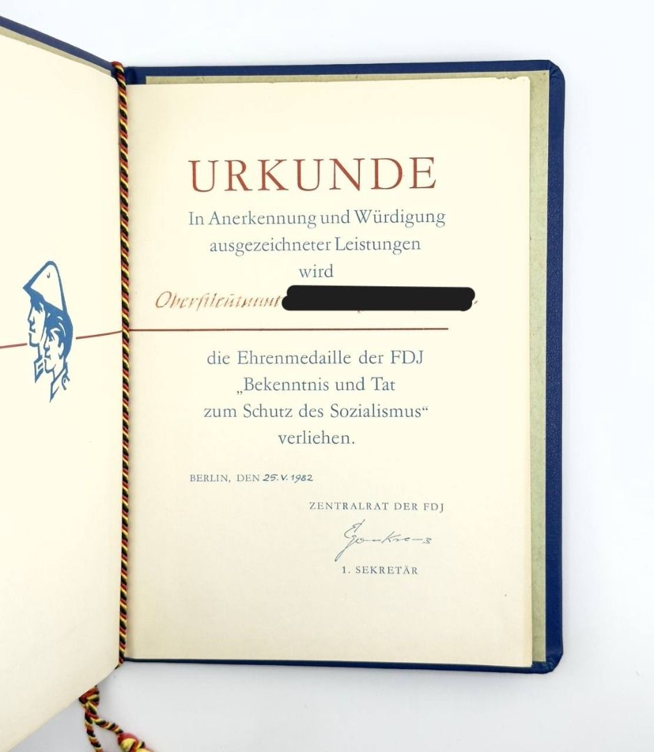 DDR FDJ Urkunde Ehrenmedaille der FDJ Schutz des Sozialismus 1982 Oberstleutnant