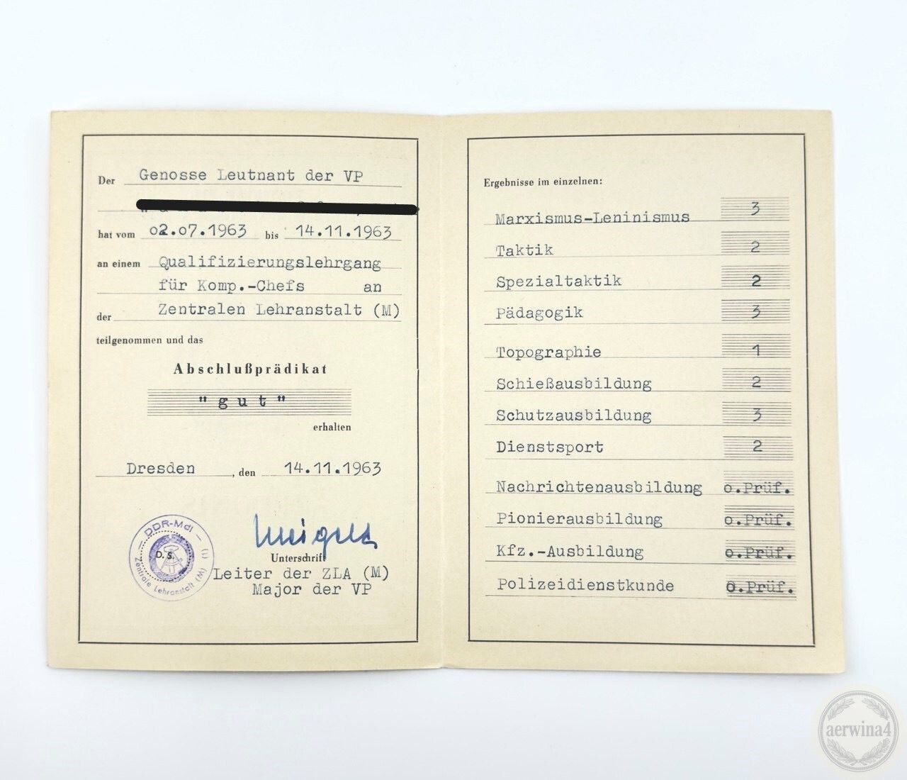 DDR MdI Volkspolizei Zeugnis Qualifizierungslehrgang Kompaniechefs Dresden 1963