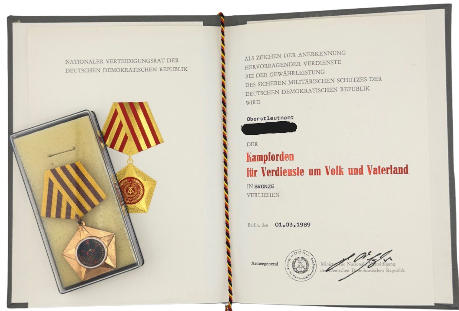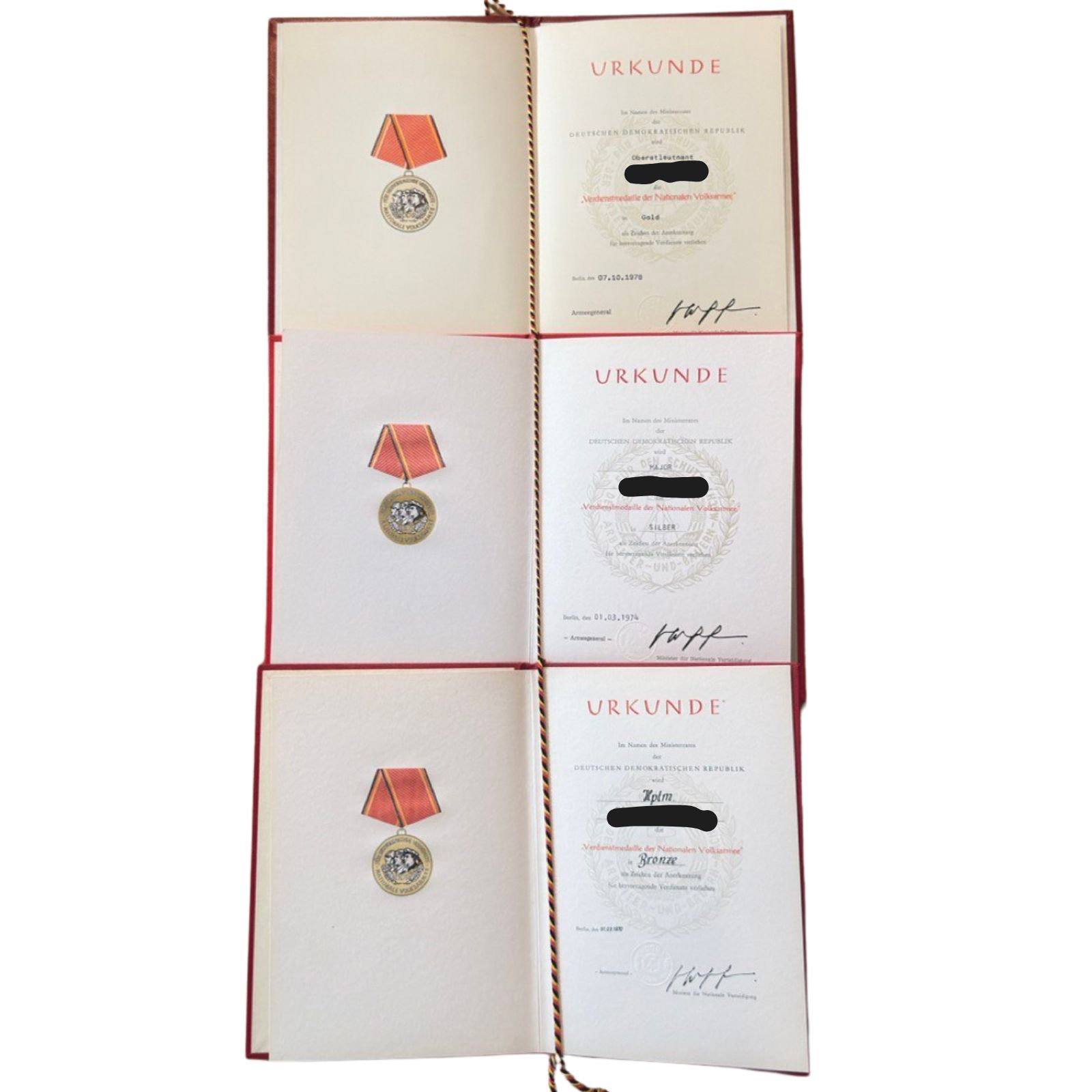 Verdienstmedaillen der NVA in Bronze, Silber, Gold – jeweils mit Urkunden