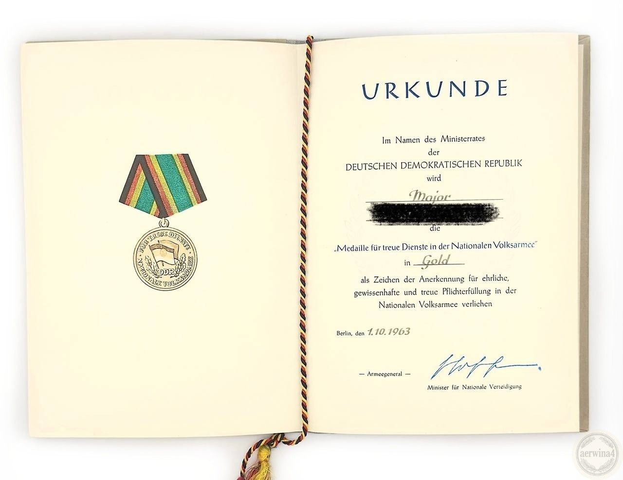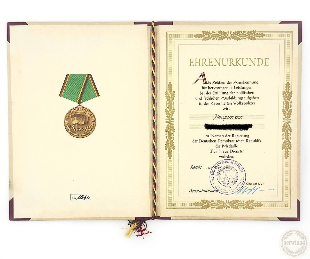 Treue Dienste KVP Medaille und UrkundeTreue Dienste NVA Bronze Medaille und UrkundeTreue Dienste NVA Silber Medaille und Urkunde (Rand Punze)Treue Dienste NVA Gold Medaille und Urkunde (Halbmond Punze, Vergoldung abgenutzt)Treue Dienste NVA 20 Jahre Medaille und Urkunde