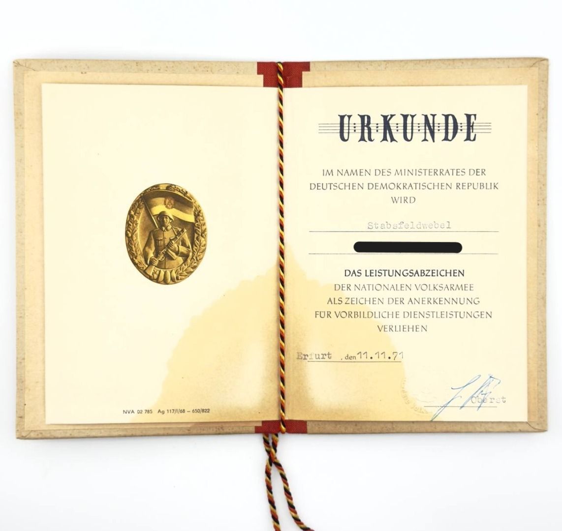 DDR NVA Urkunde Leistungsabzeichen der Nationalen Volksarmee 1971 Stabsfeldwebel