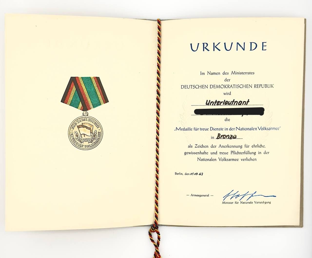 DDR NVA Urkunde treue Dienste in der NVA Bronze 1963 Unterleutnant
