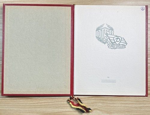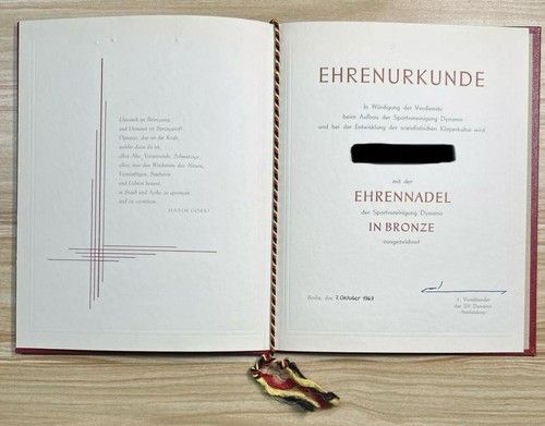 DDR SV DYNAMO DTSB Urkunde-Silber -Ehrennadel - Berlin. Nadelloch 1. Seite