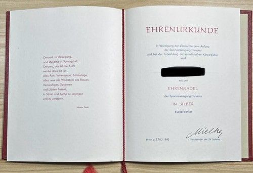 DDR SV DYNAMO DTSB Urkunde-Silber -Ehrennadel - Berlin.