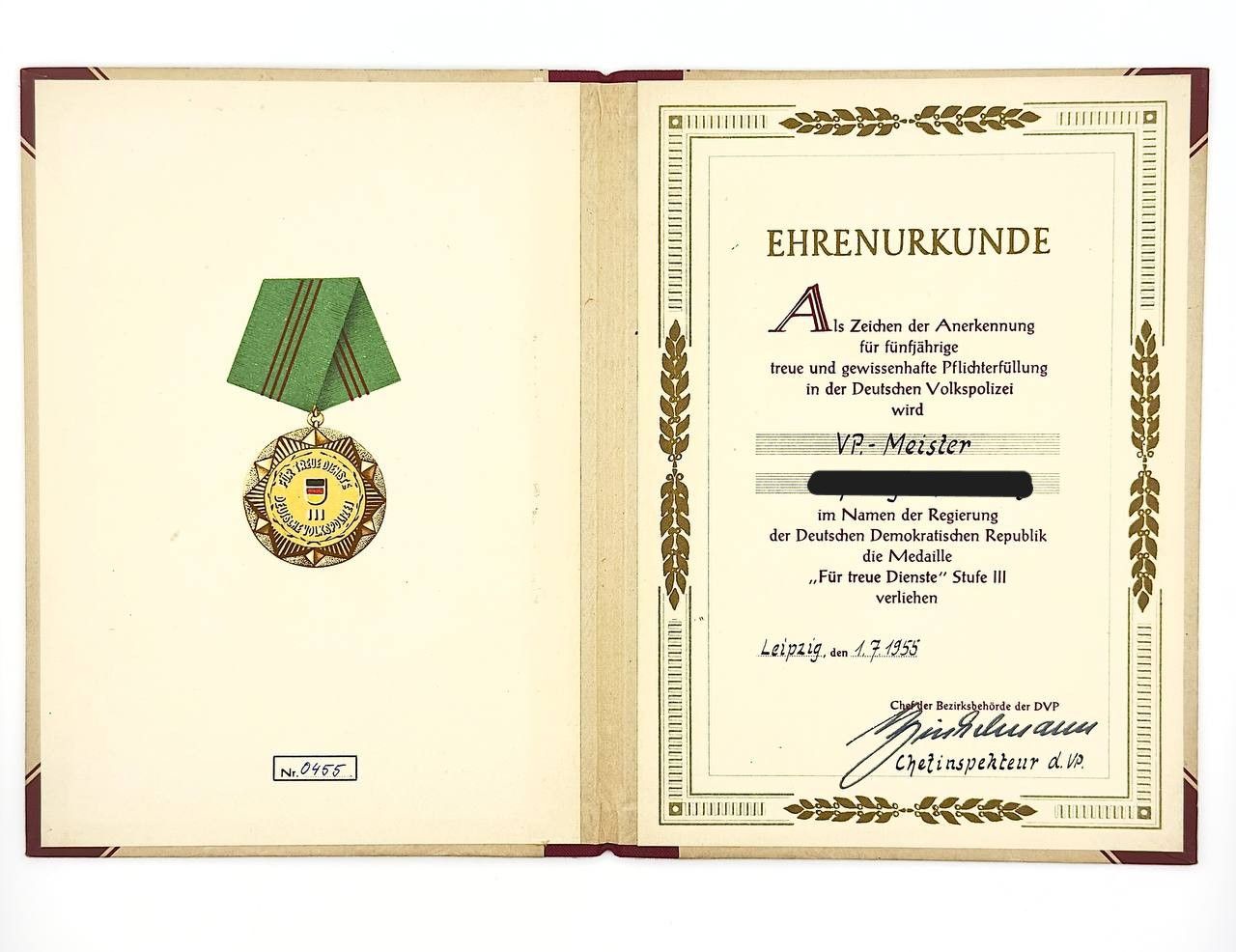 DDR Urkunde Volkspolizei treue dienste Stufe III 1955 VP-Meister