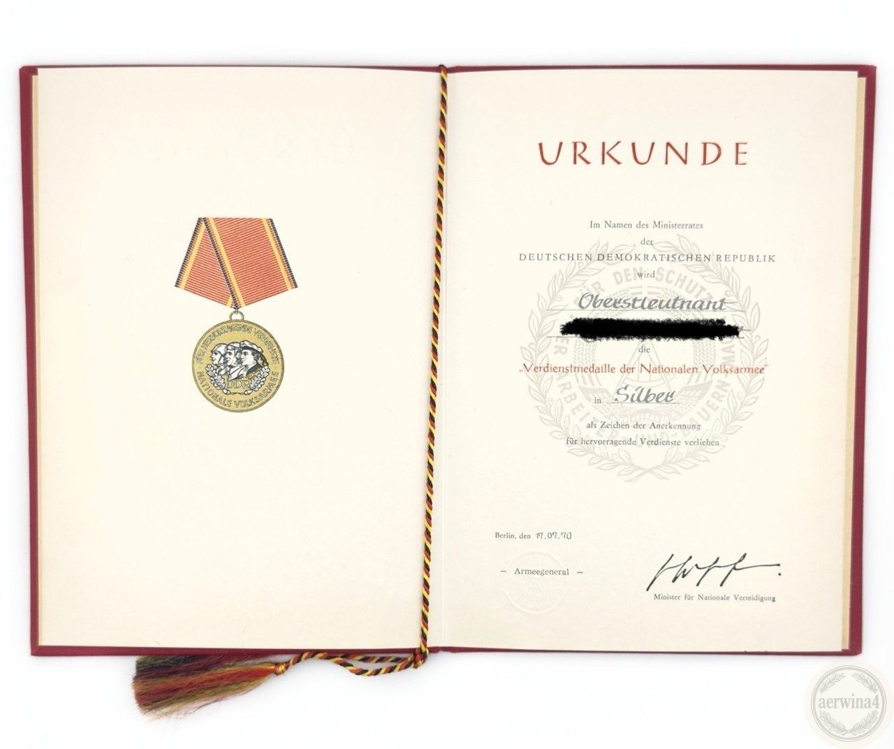DDR Verdienstmedaille der NVA in Silber 900 Punze 4 Urkunde Oberstleutnant 1970